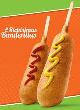 Banderilla acompañada de queso de nachos con mayonesa, mostaza y cátsup.