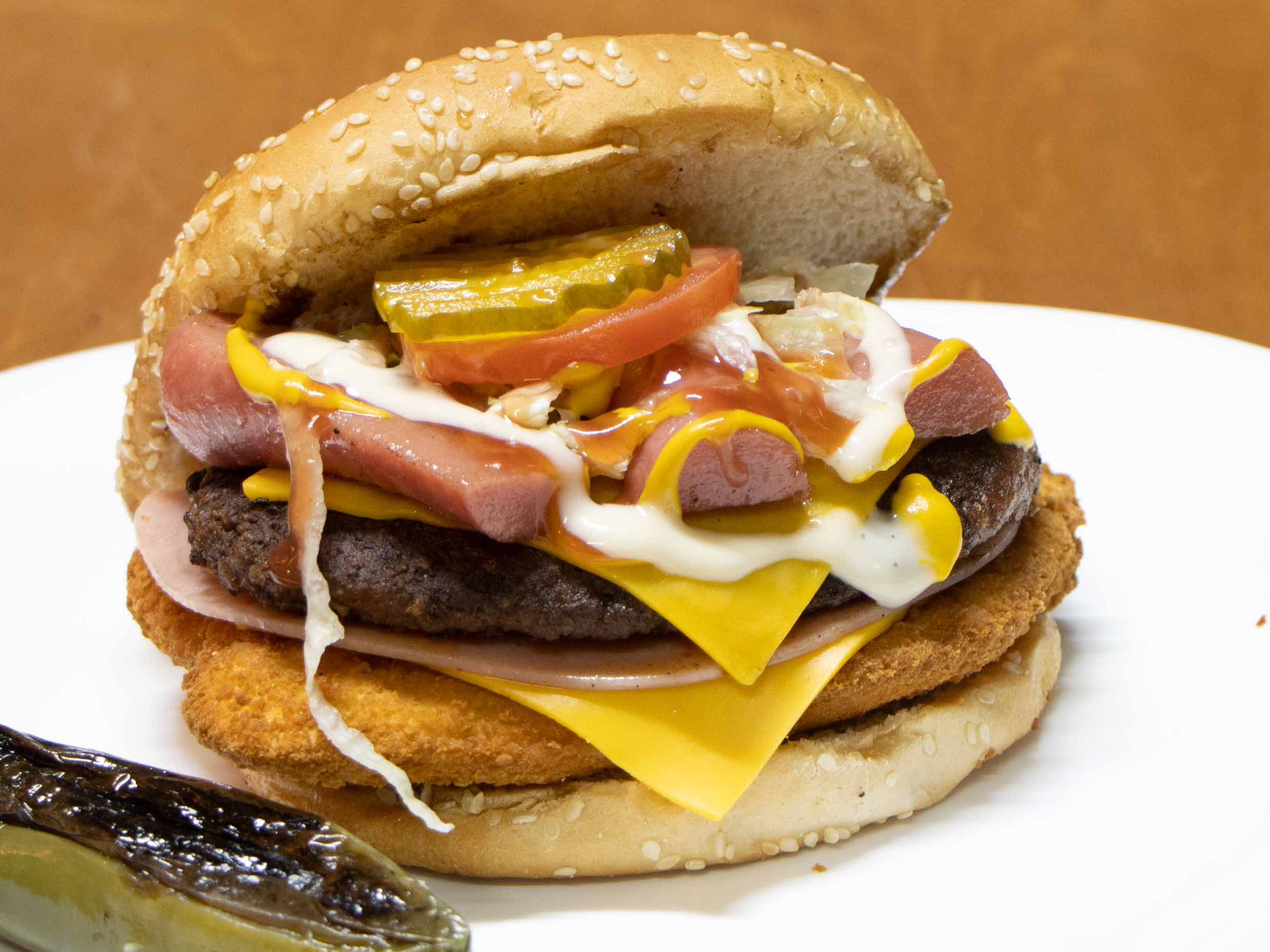 Deliciosa hamburguesa con carne, pechuga de pollo, dos quesos, 2 winnie , 2 jamones.