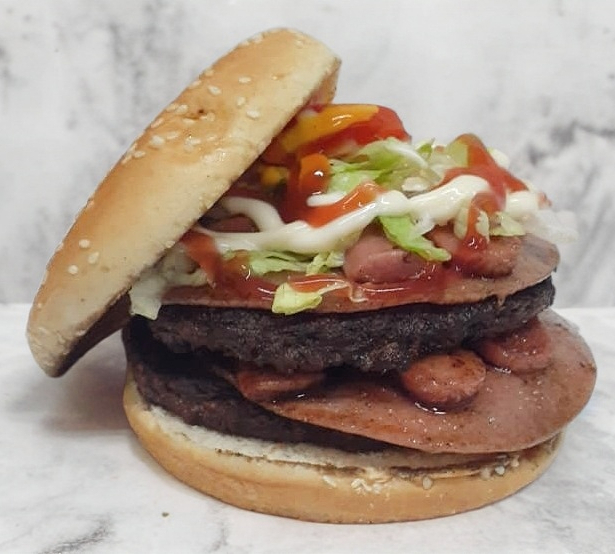 Deliciosa hamburguesa con dos carnes, dos quesos, 2 winnie , 2 jamones.