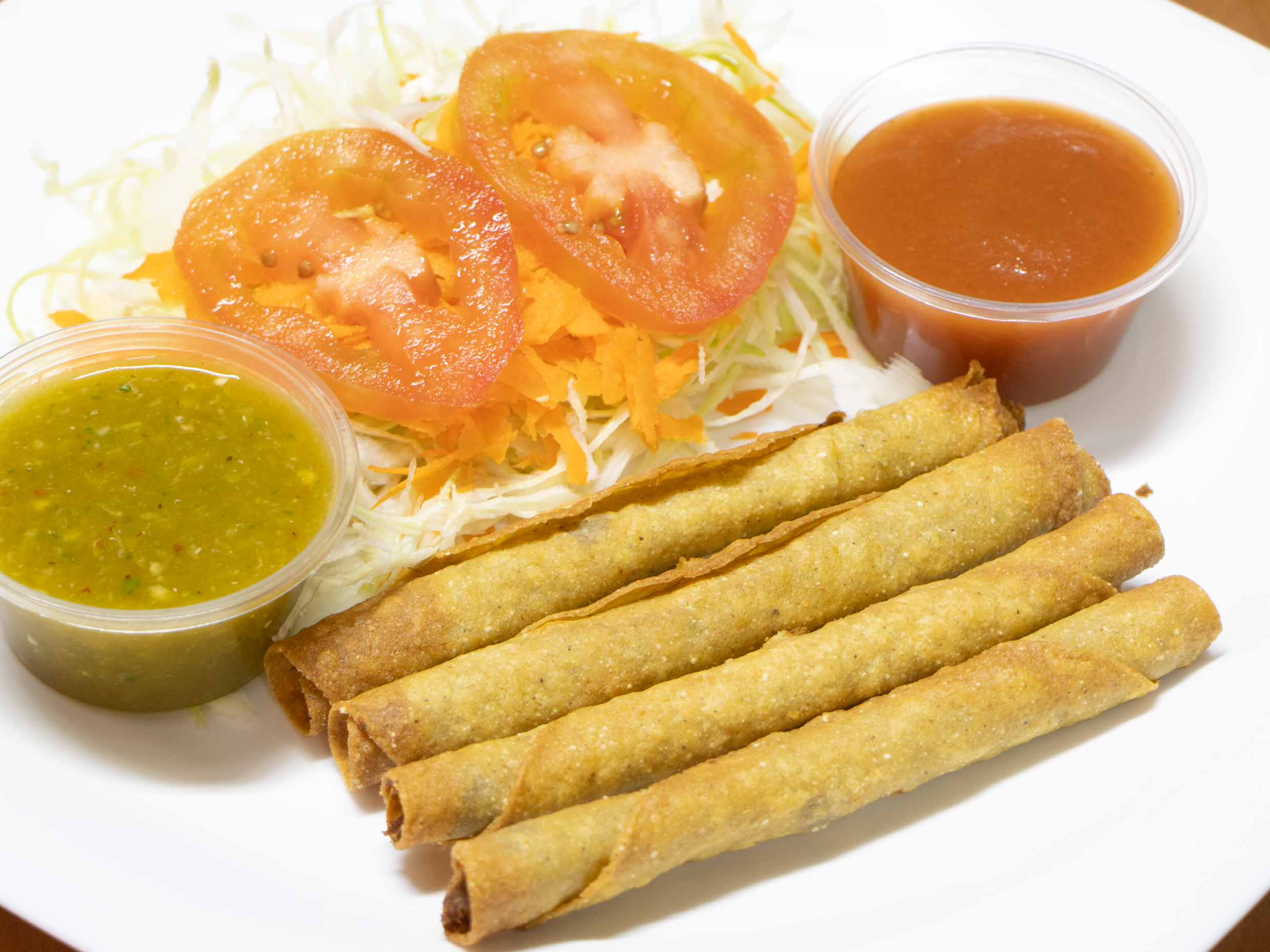 Orden de flautas acompañadas de repollo y zanahoria rallada así como salsa verde y salsa de tomate.