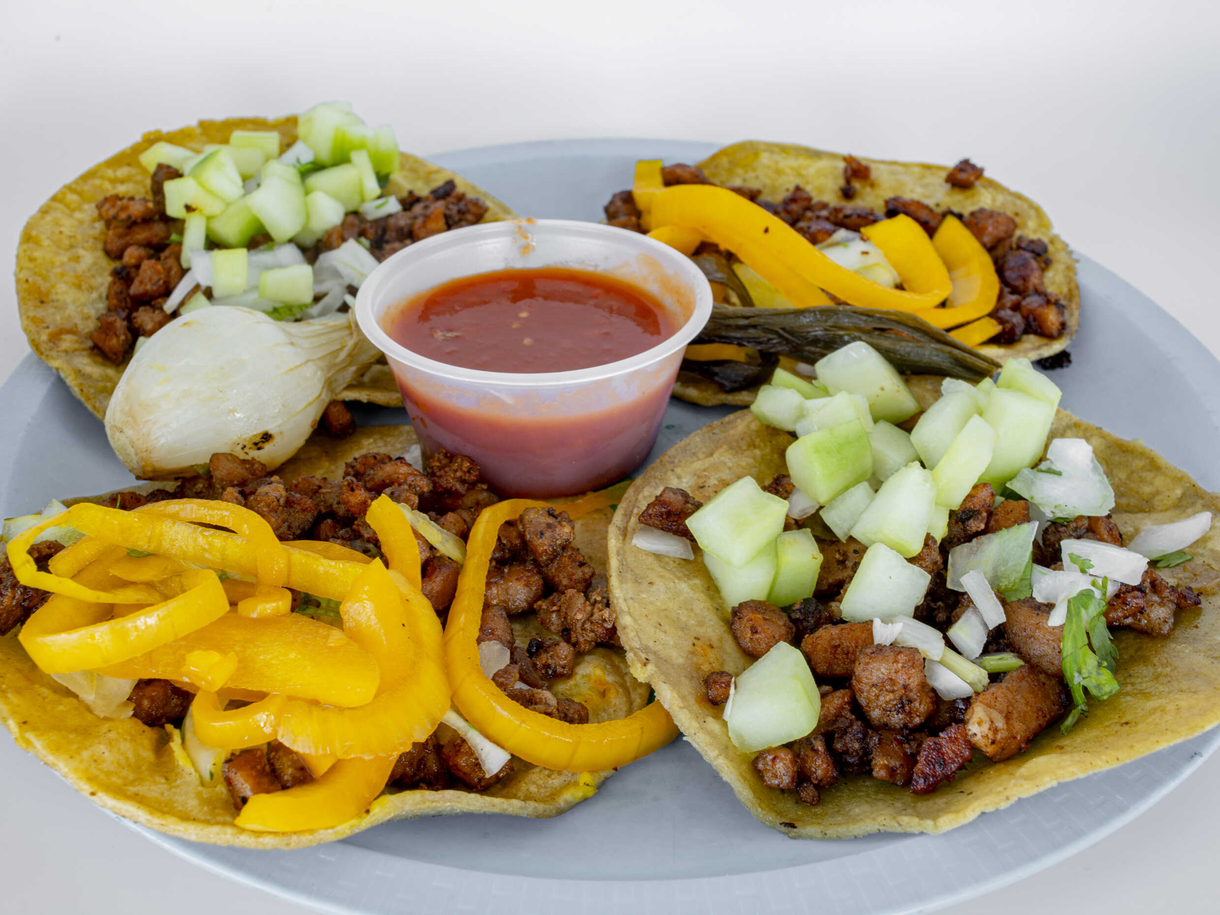 orden de 4 tacos acompañados de piña verduras y salsas