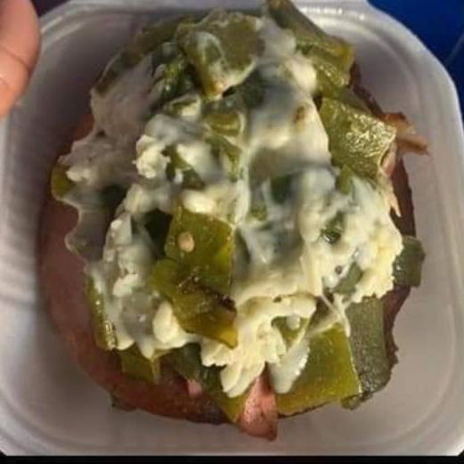 Carne de sirloin, queso amarillo, jamón winny, lechuga, tomate, pepinillos, cebolla guisada y sus líquidos acompañada de chile toreado.