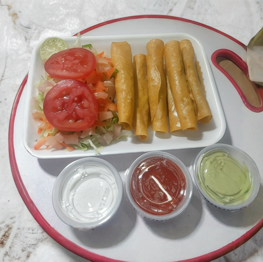 6 Flautas acompañadas de lechuga, tomate, crema, salsas