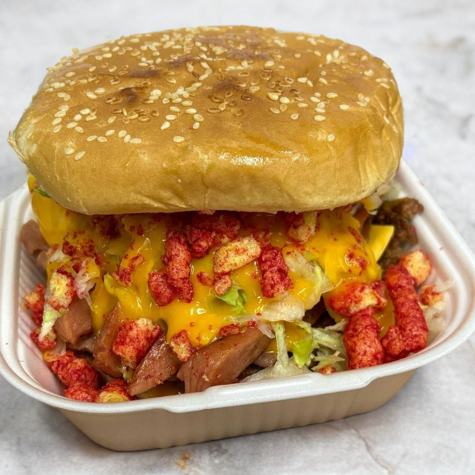Pepinillos, lechuga, líquidos, queso amarillo, winnie, queso de nachos, tocino, jamón, carne, aguacate y papitas.