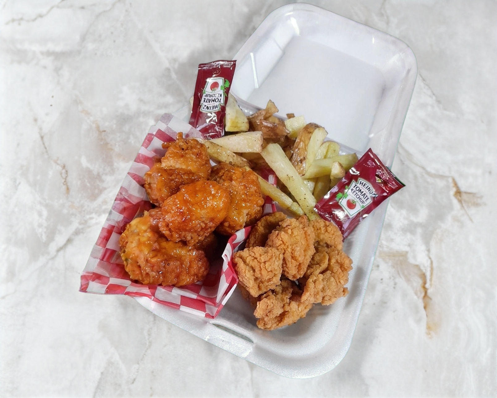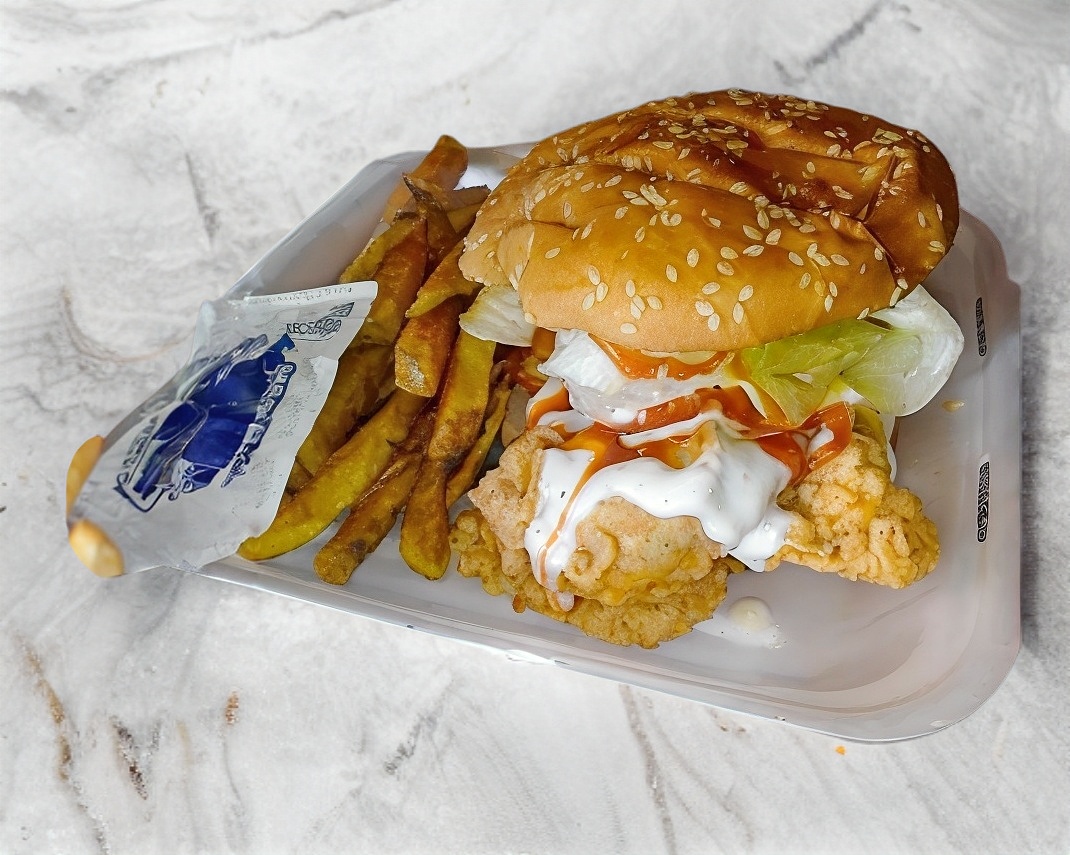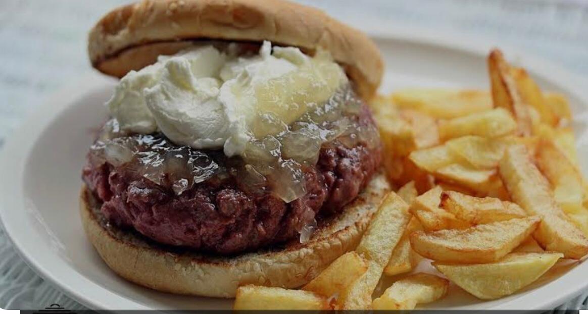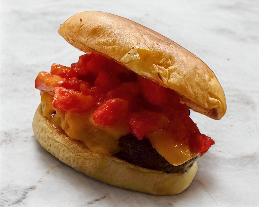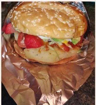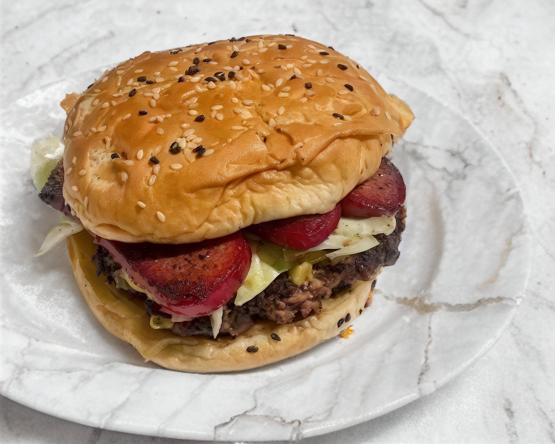 Hamburguesa con carne de res artesanal y pollo, jitomate, lechuga, salsa de chile toreado. (Porción personal)