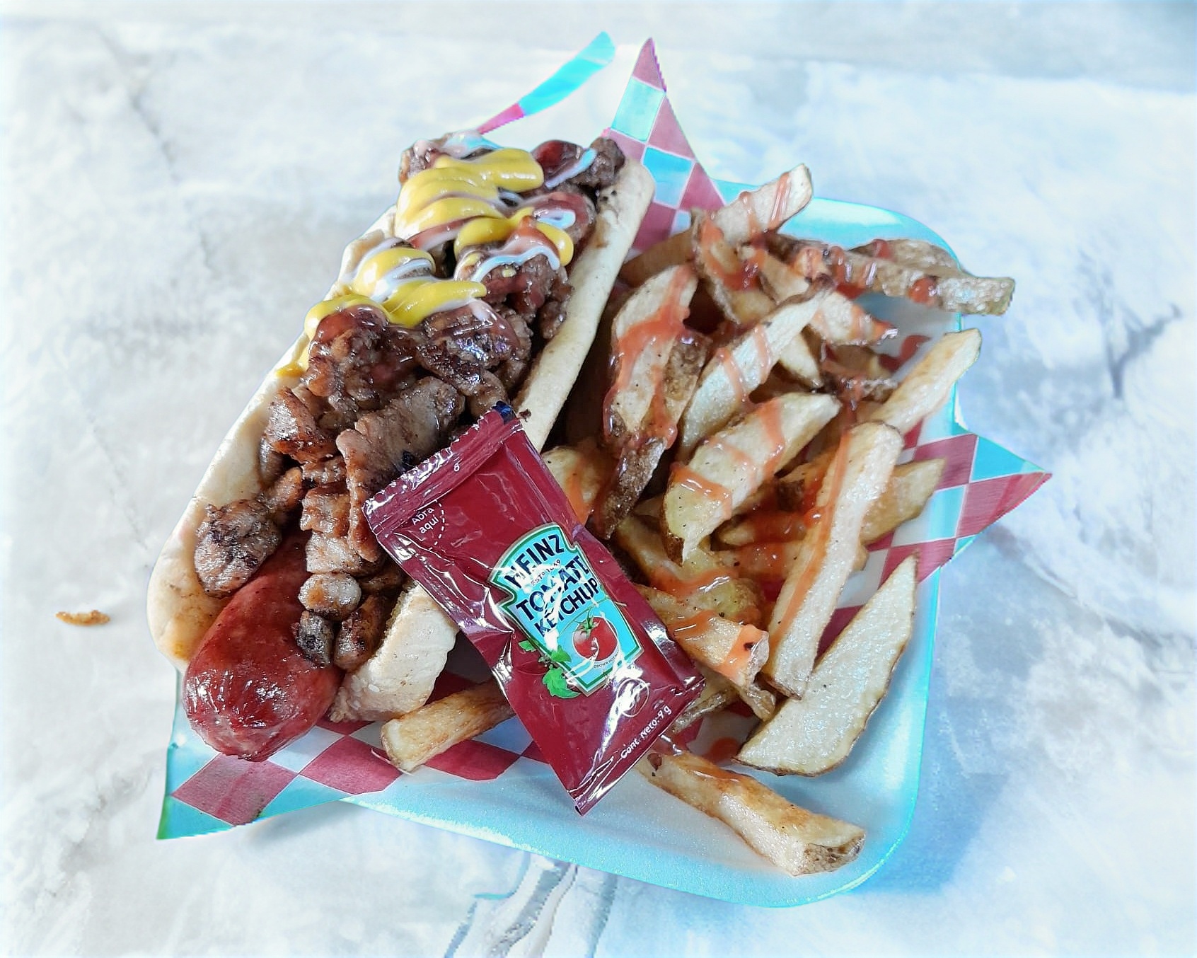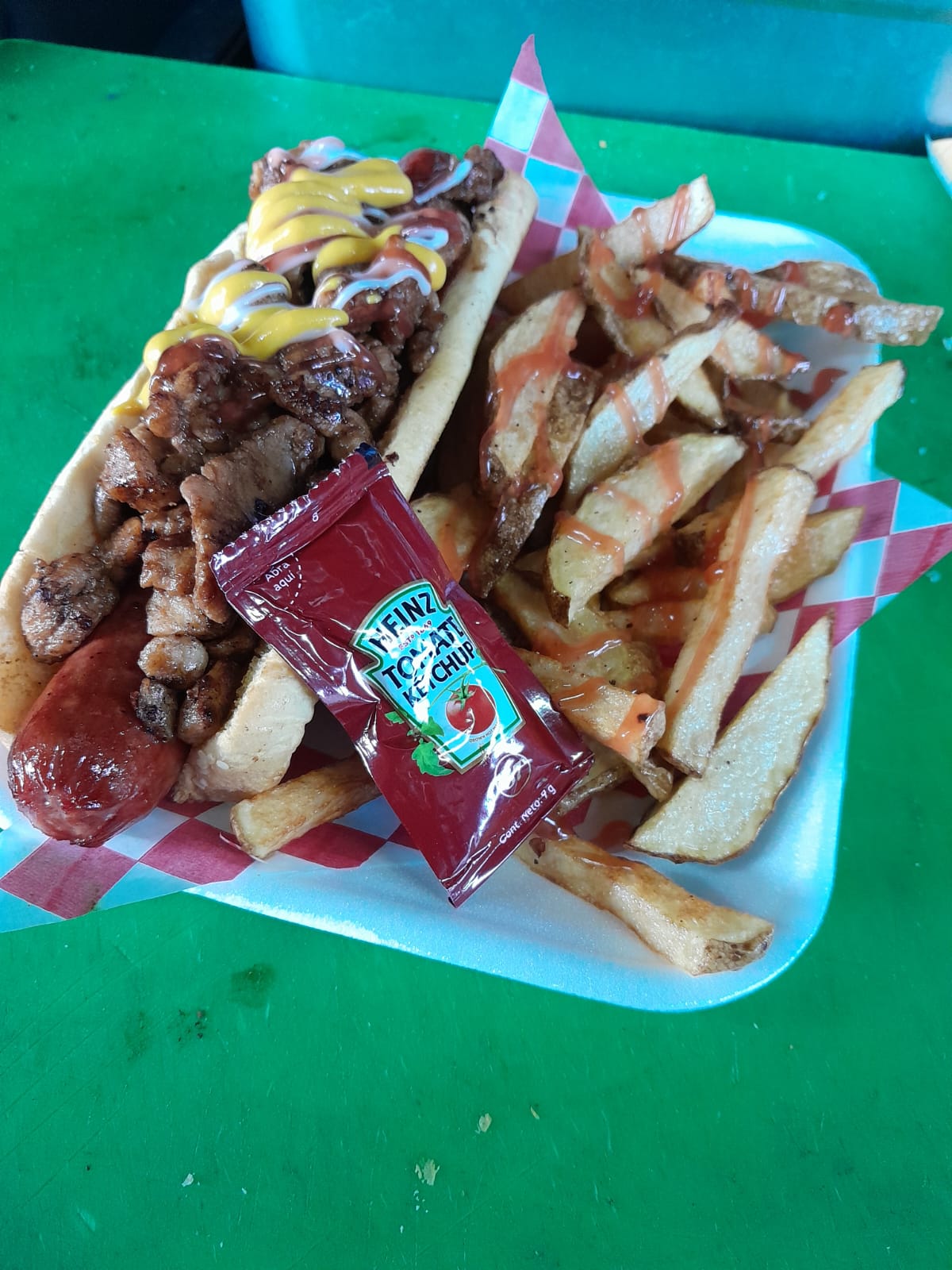 Pan para hotdog grande con salchicha acompañada de bistec ala plancha, Mayonesa, catsup, Mostaza y papitas fritas