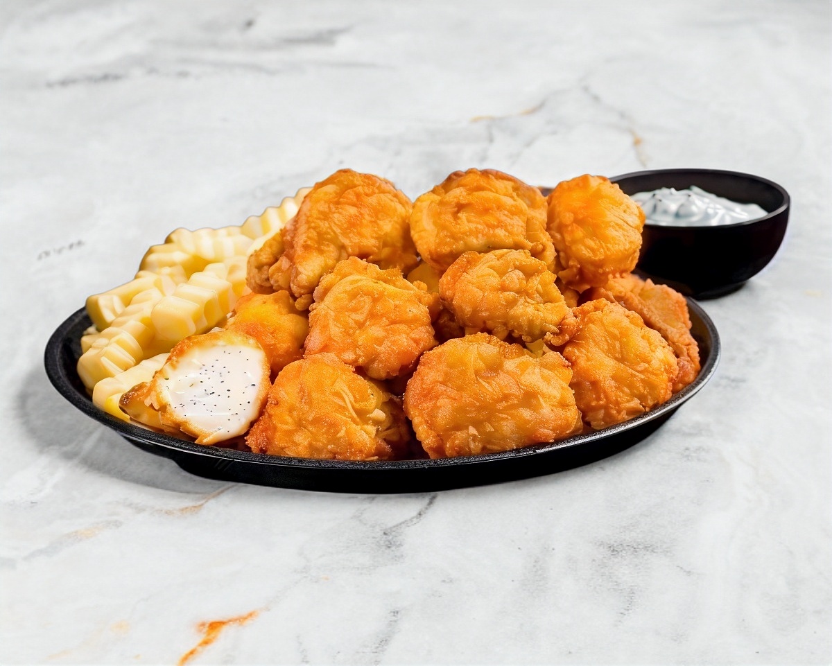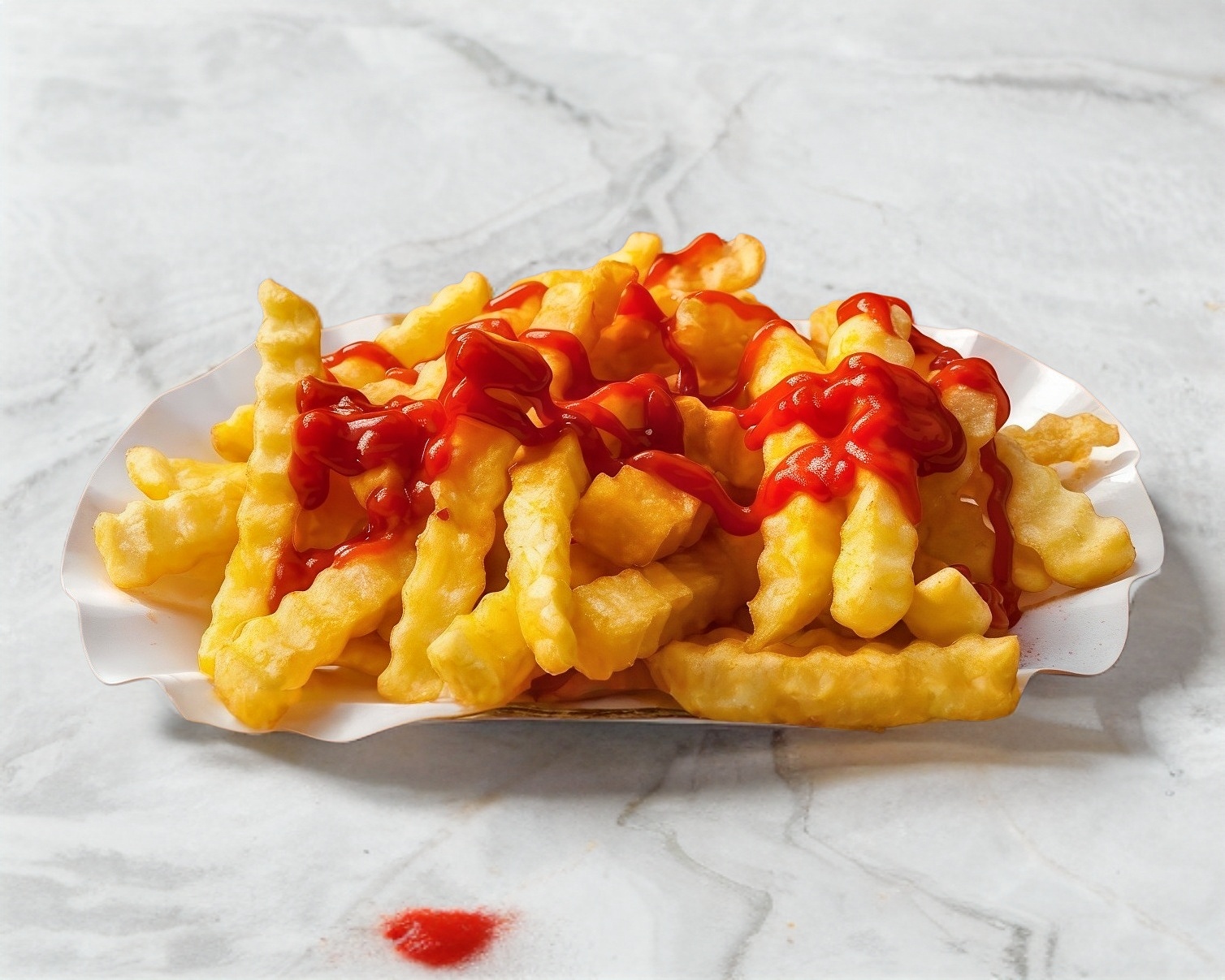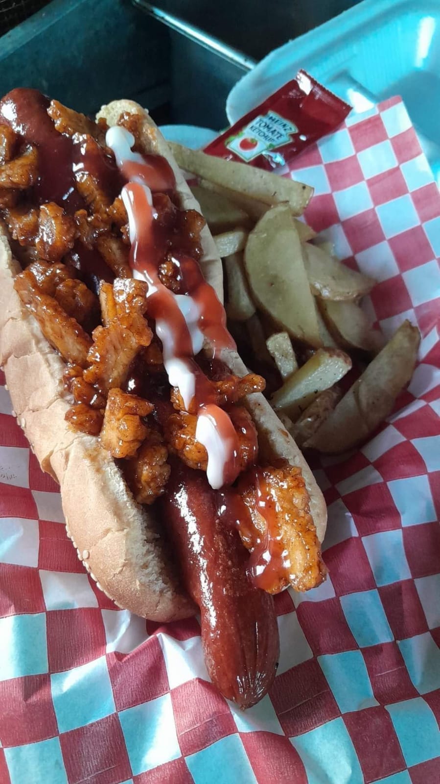 Pan para hotdog grande con salchicha acompañada de carne al pastor, Mayonesa, Catsup, Mostaza y papitas fritas