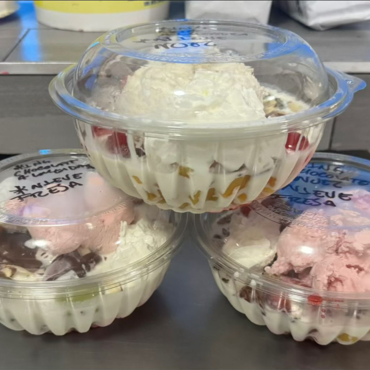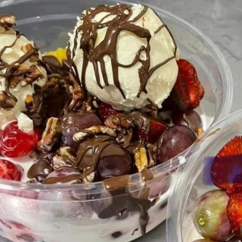chocolate, nuez, mango congelado, fresa congelada, frutos congelados, uvas, fresas, duraznos, cerezas y nieve de vainilla