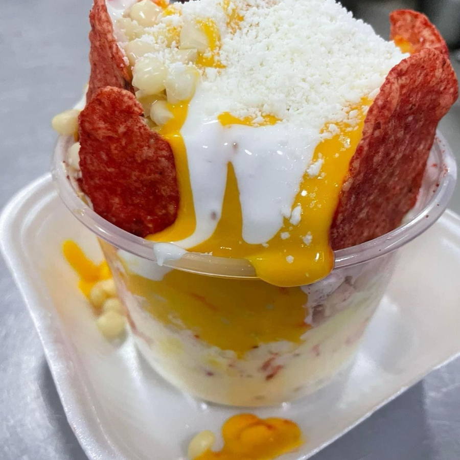elote, mantequilla, mayonsa, crema, queso, queso amarillo y tostitos flamin hot