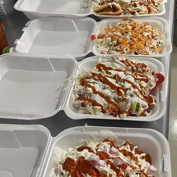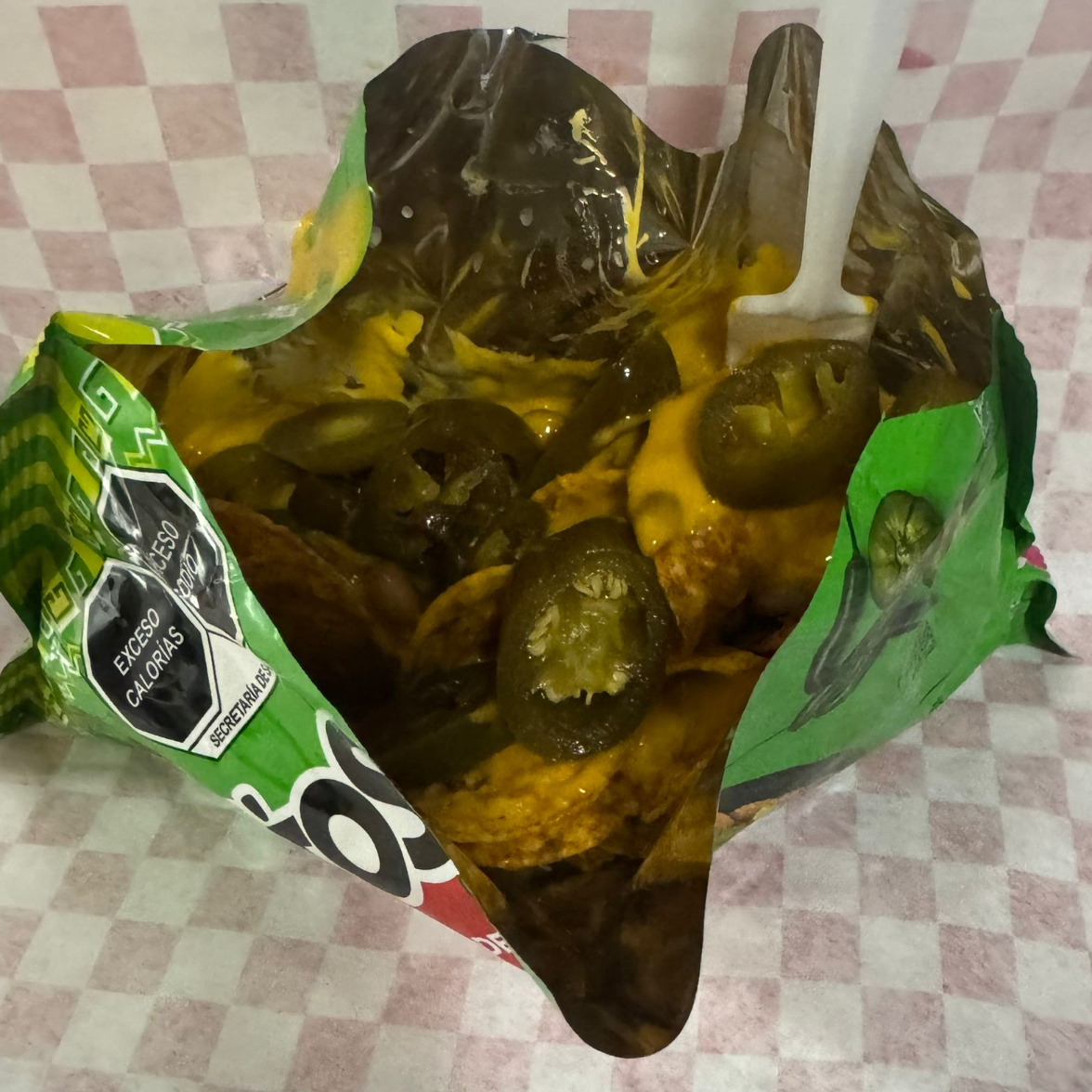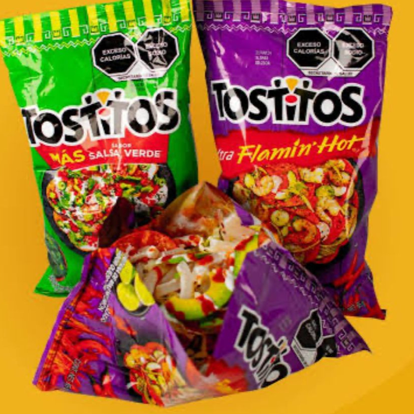 tostitos flamin hot, repollo, tomate, cueritios y crema