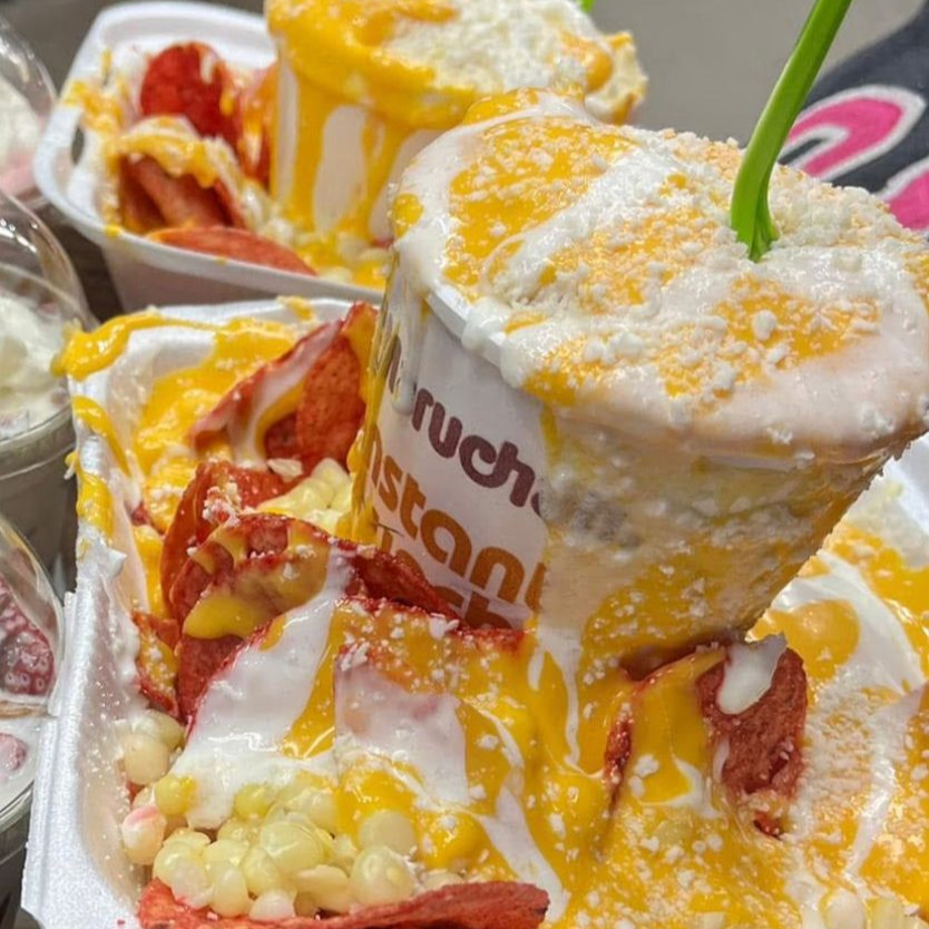 elote, mantequilla, queso, crema, mayonesa y tostitos flamin hot
