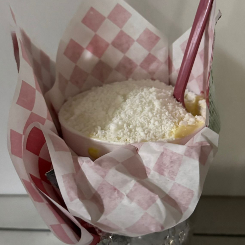 vaso de elote en grano,mantequilla, mayonesa, crema y queso