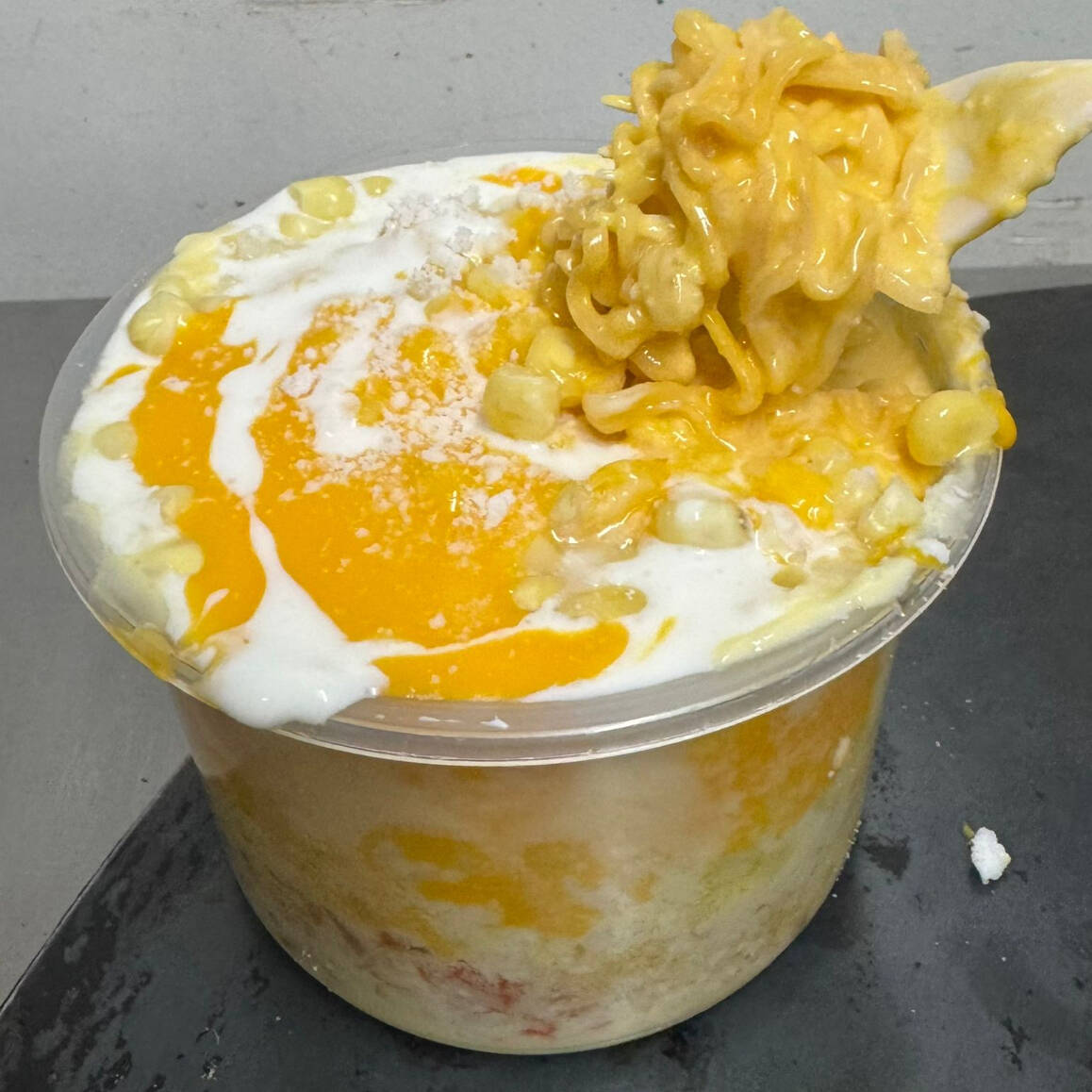 maruchan, elote, mantequiila, queso, crema y queso amarillo