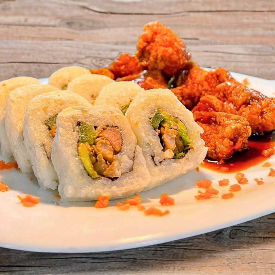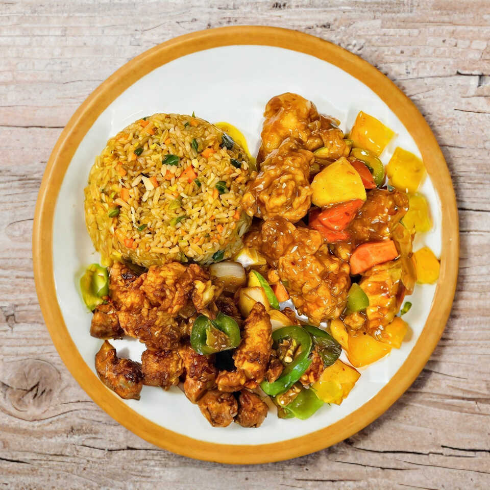 Combo con 1 guisado de comidita china , arroz y un rollo de sushi
