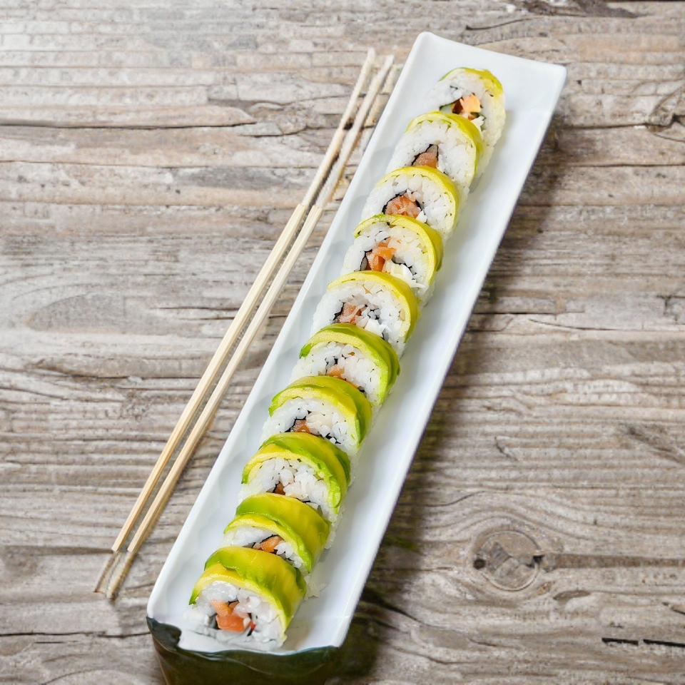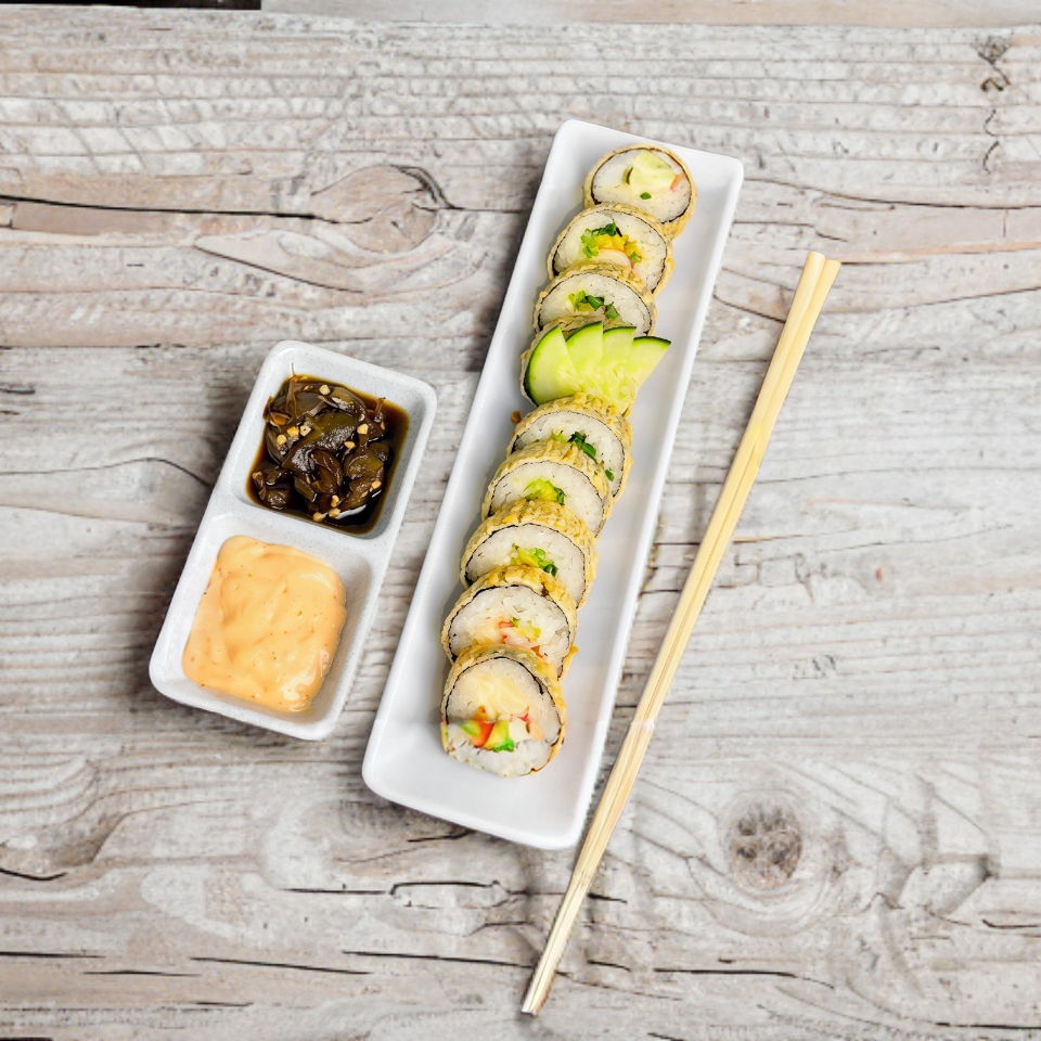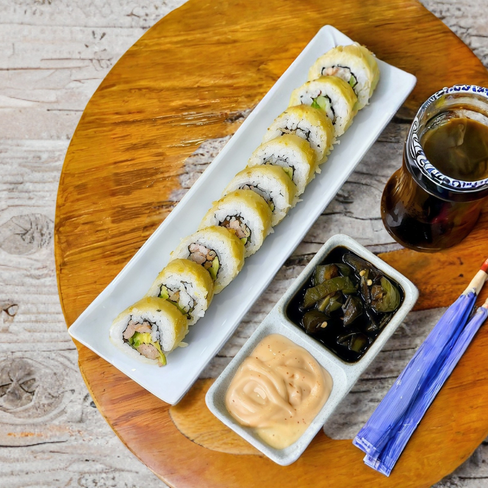Surimi Aguacate queso crema cebollin chiles toreados envuelto en alga