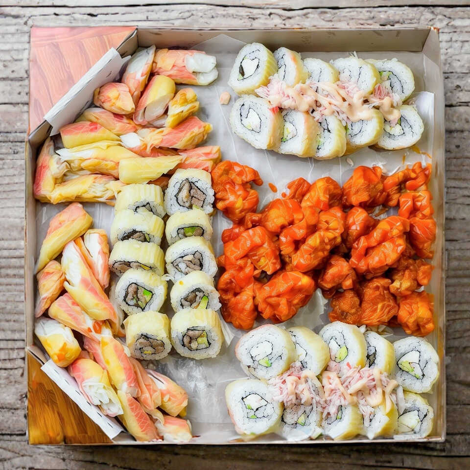 Caja de Pizza pero con 3 rollo de sushi, 1/2 de alitas o boneless, y 2 complementos a elejir, cuando la resivas abrela y revisa que el repartidor no la haya vatido!