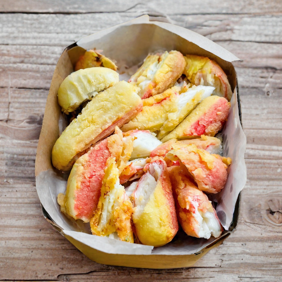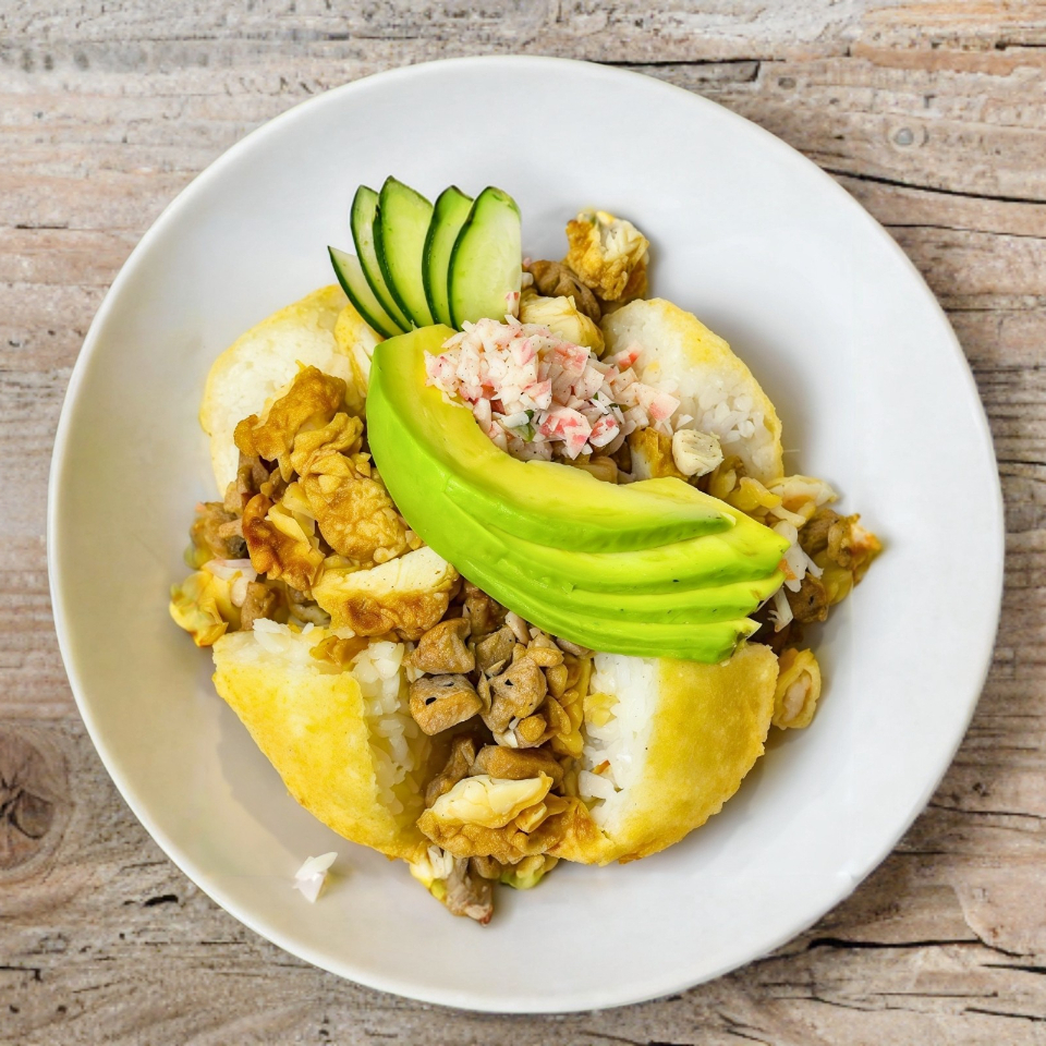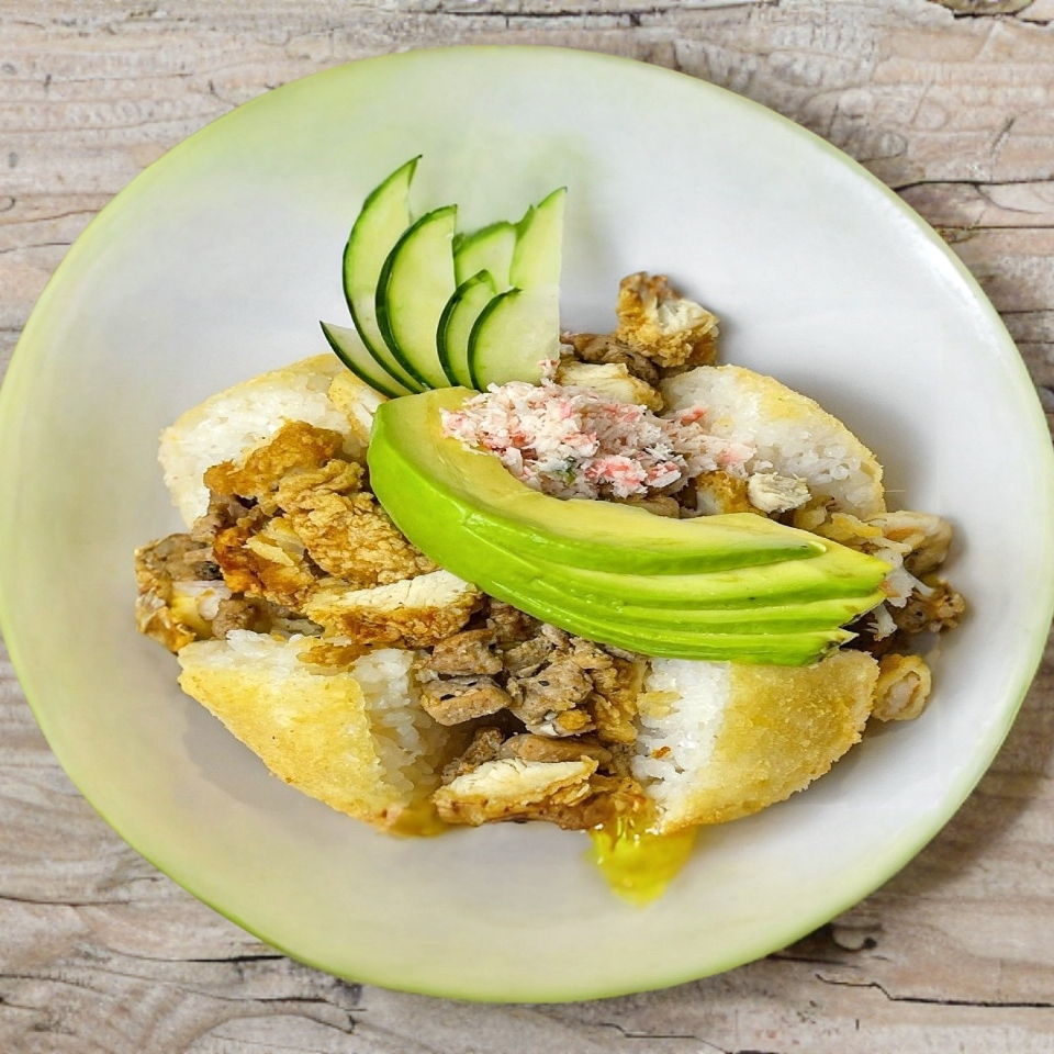 Esto es una bola de arroz empanizada y frita, del tamaño de una pelota de beisbol con aguacate surimi y carne de cerdo