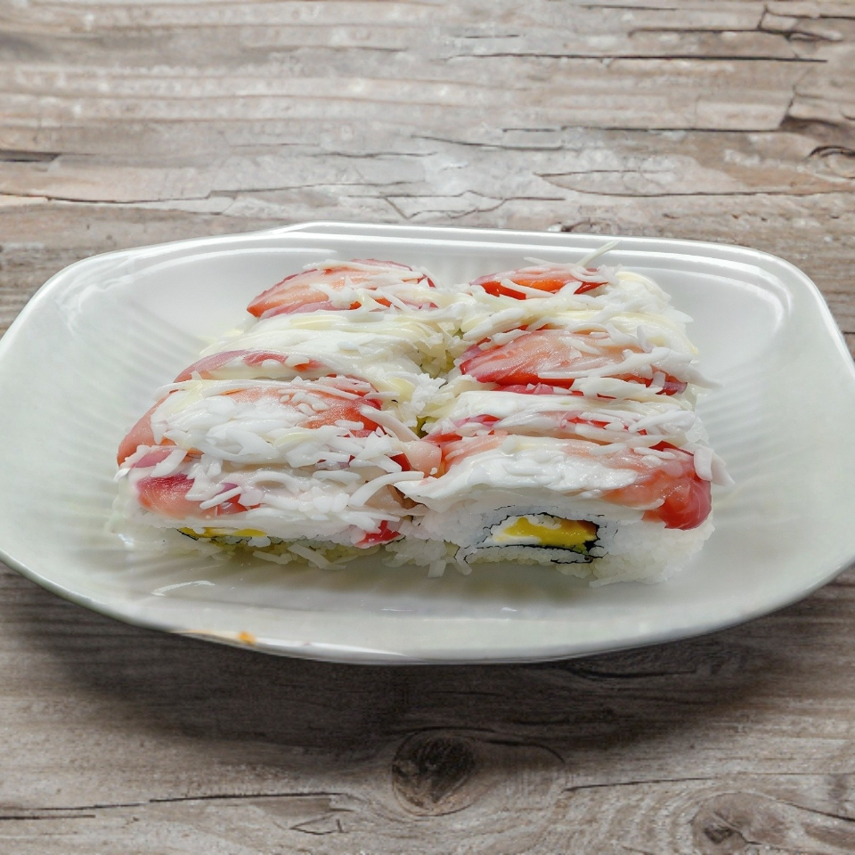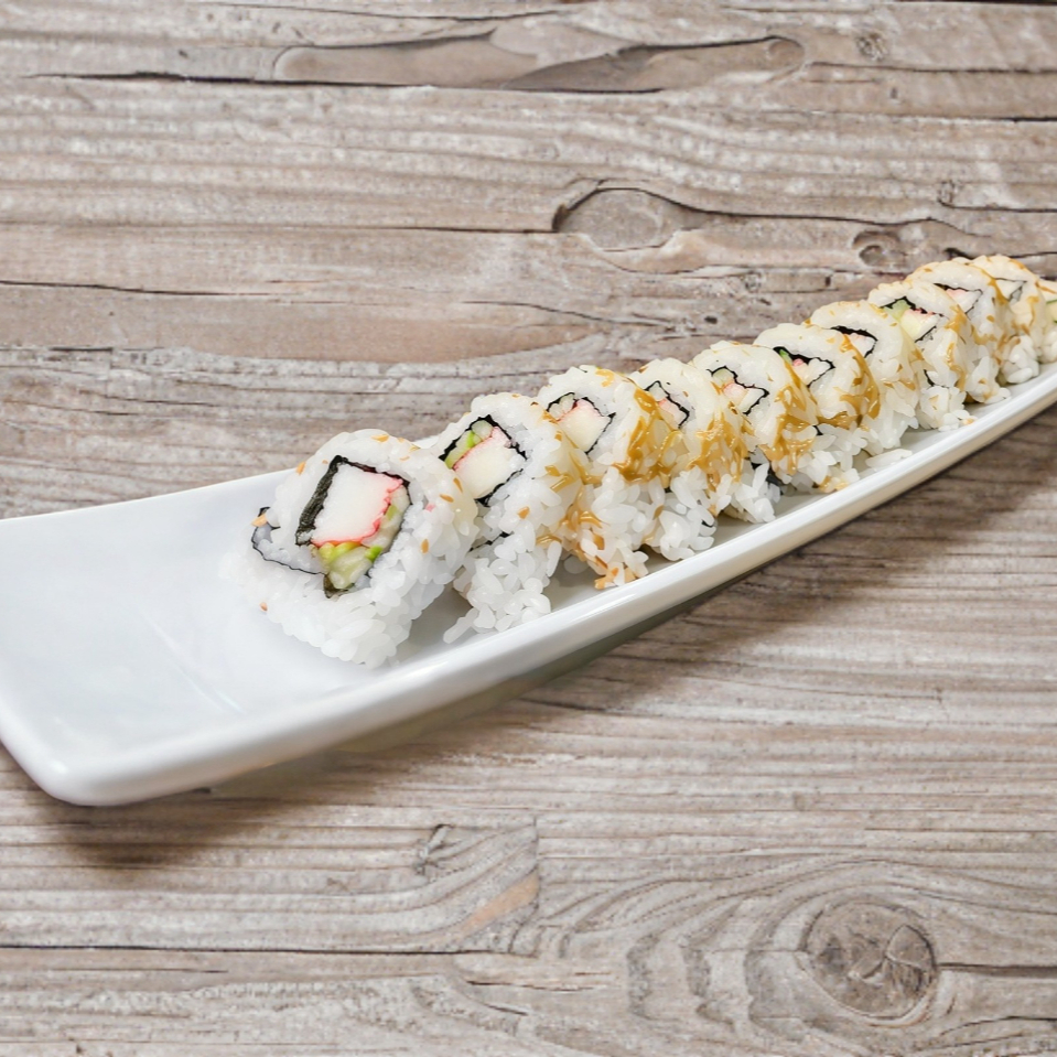 Camaron, Kanikama, aguacate y cubierto con queso crema