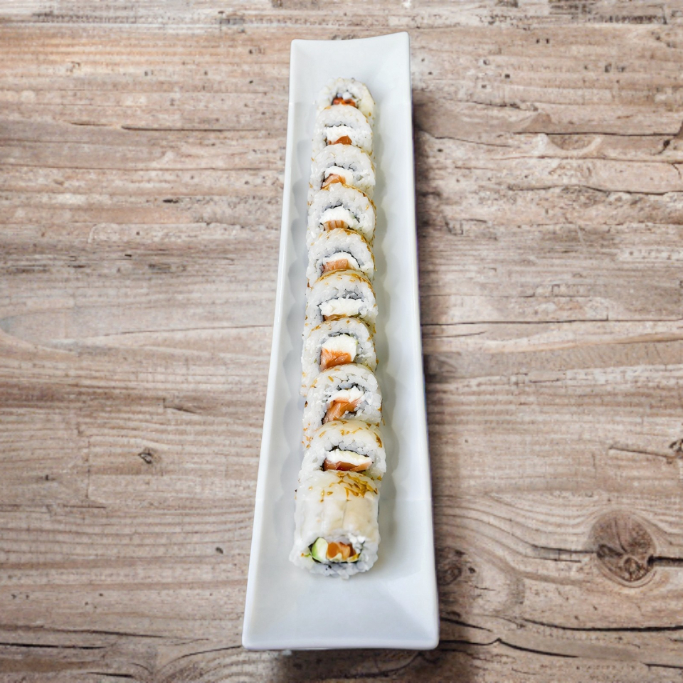 Queso Crema , Pepino , Salmon, cubierto con aguacate