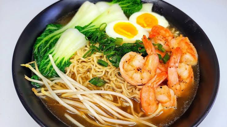 Exquisito caldo con fideos, jugosos camarones, alga nori, naruto (pastel de pescado) y huevo marinado. ¡Un toque de mar en tu tazón!