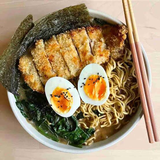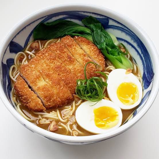 Caldo con fideos, pollo empanizado crujiente, alga nori, naruto y huevo. ¡Disfruta de la combinación de texturas en un mismo tazón!