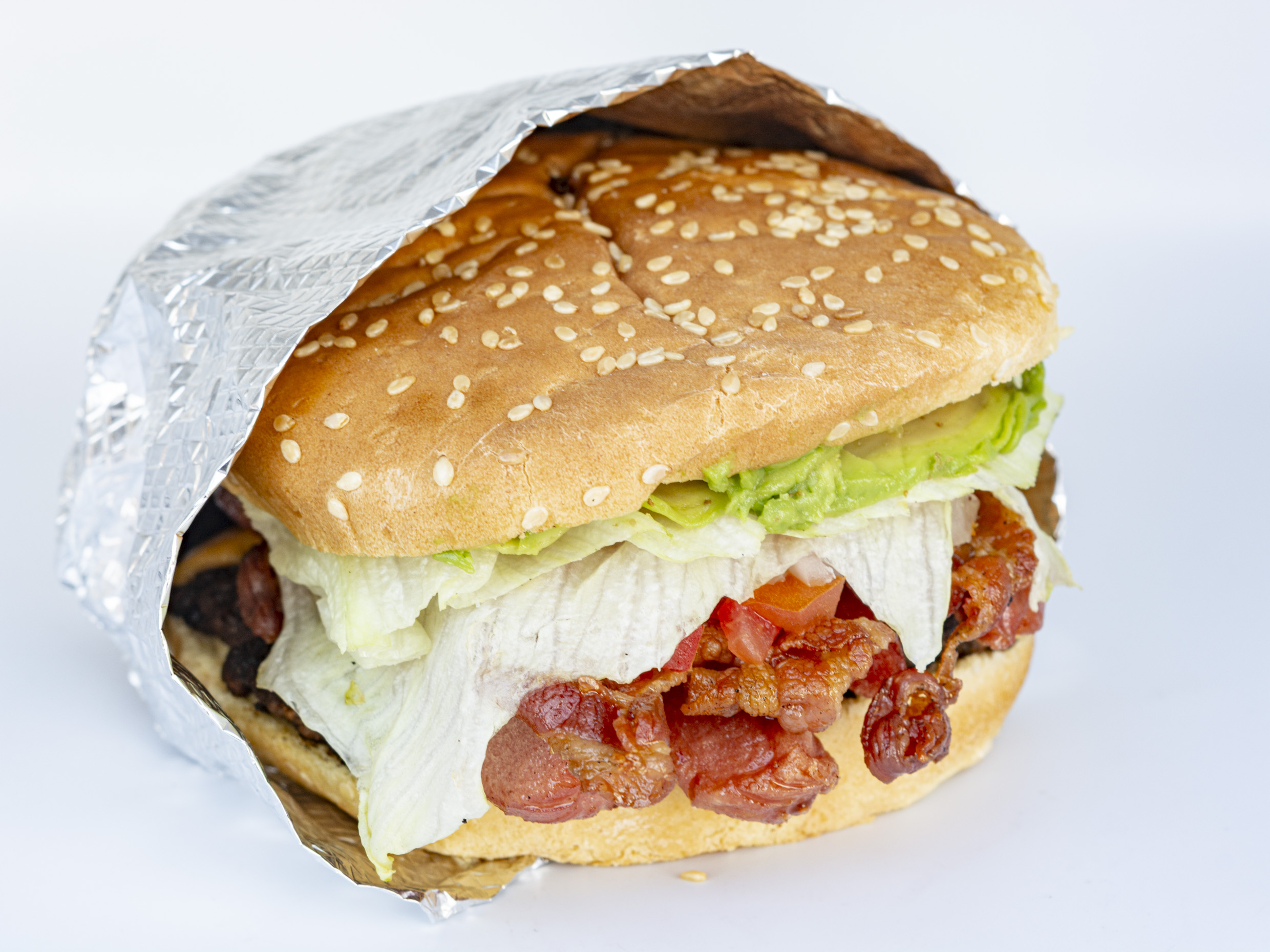 Carne, queso, winnie, tocino, aguacate, lechuga, tomate cebolla y liquidos