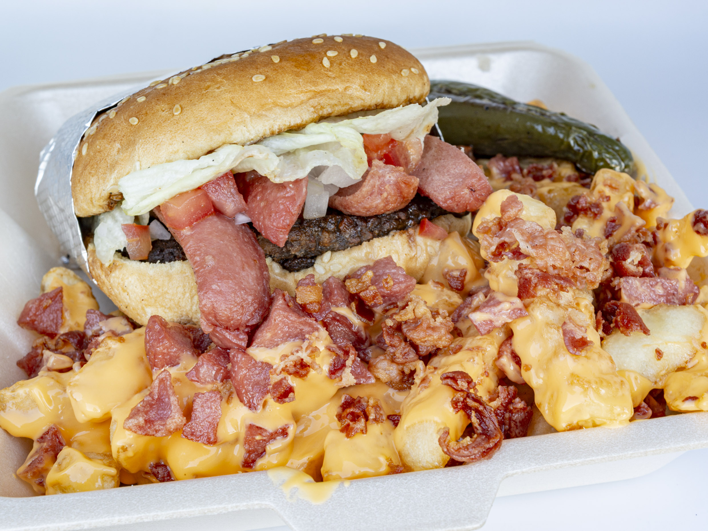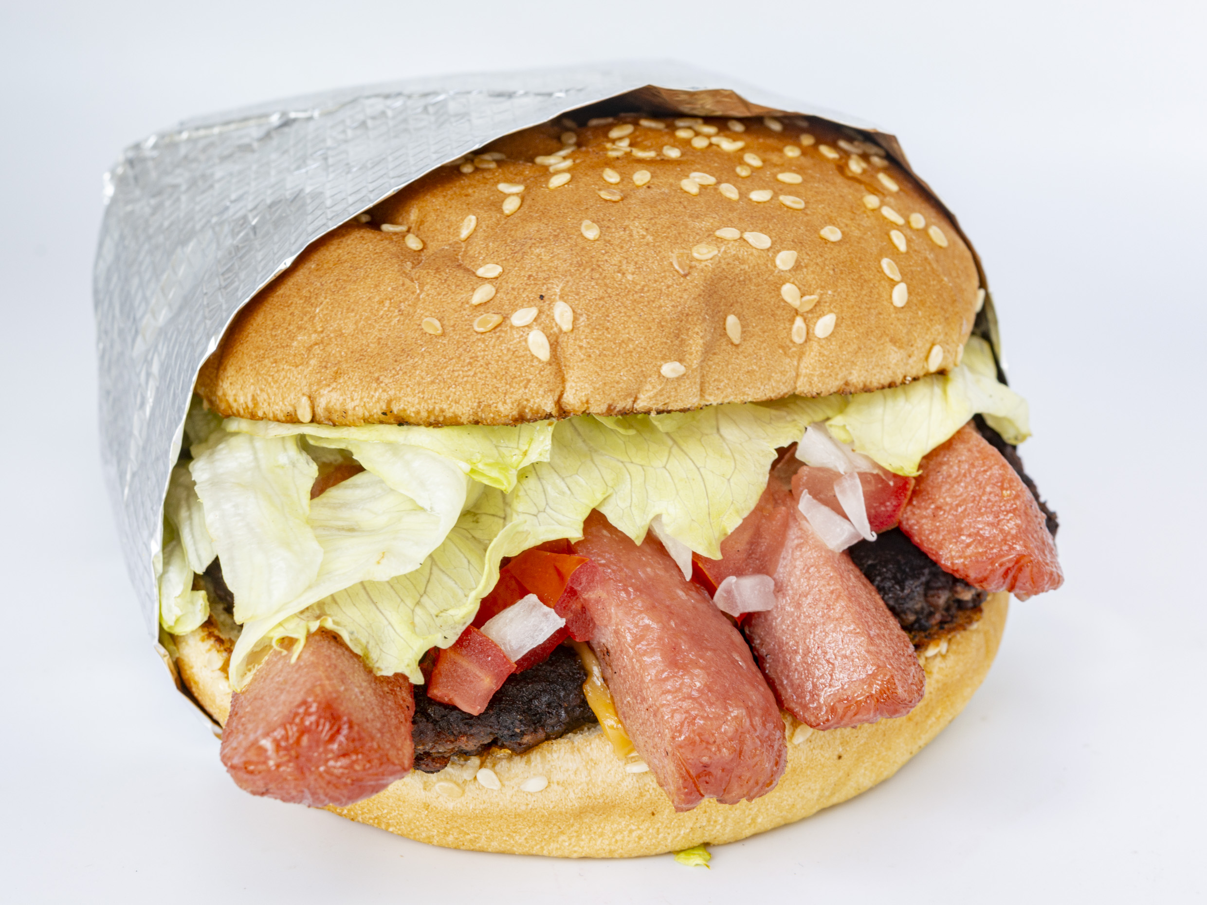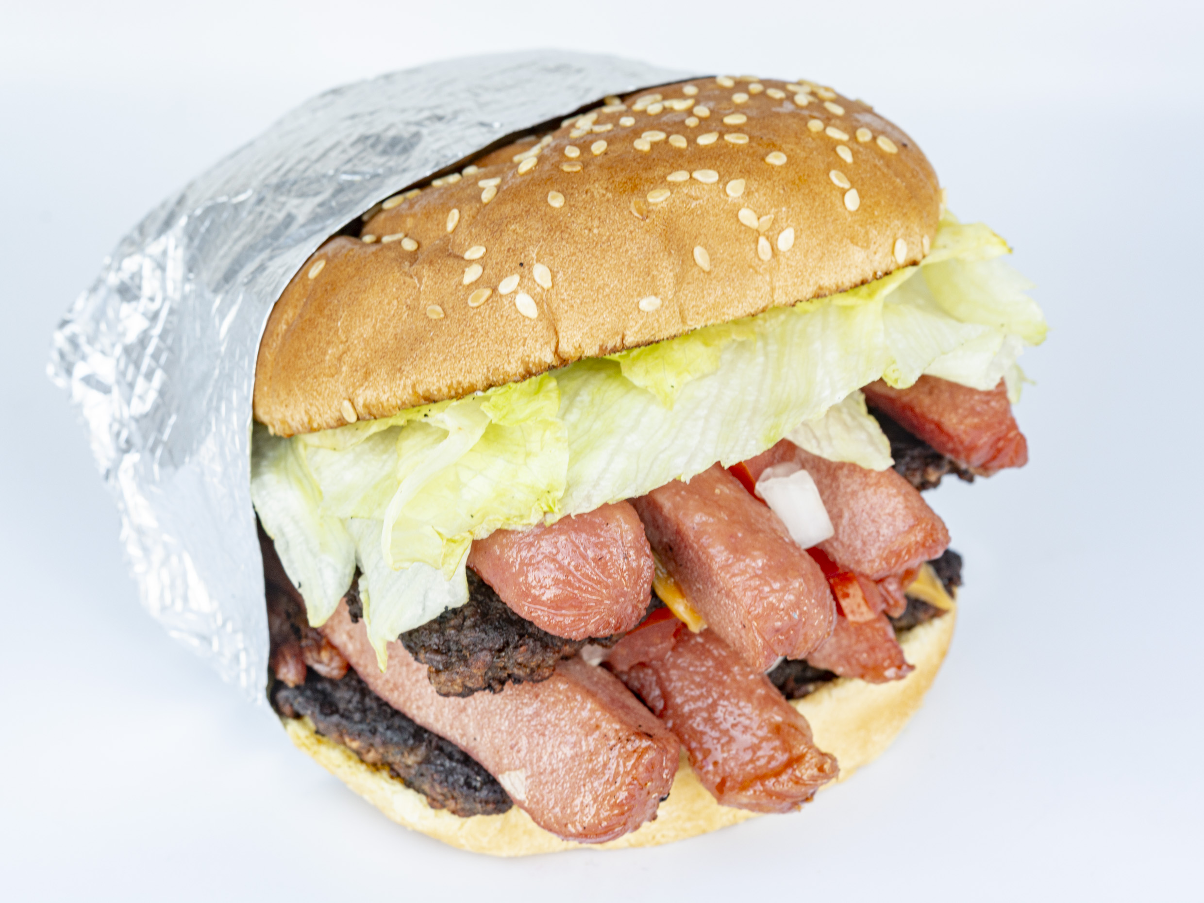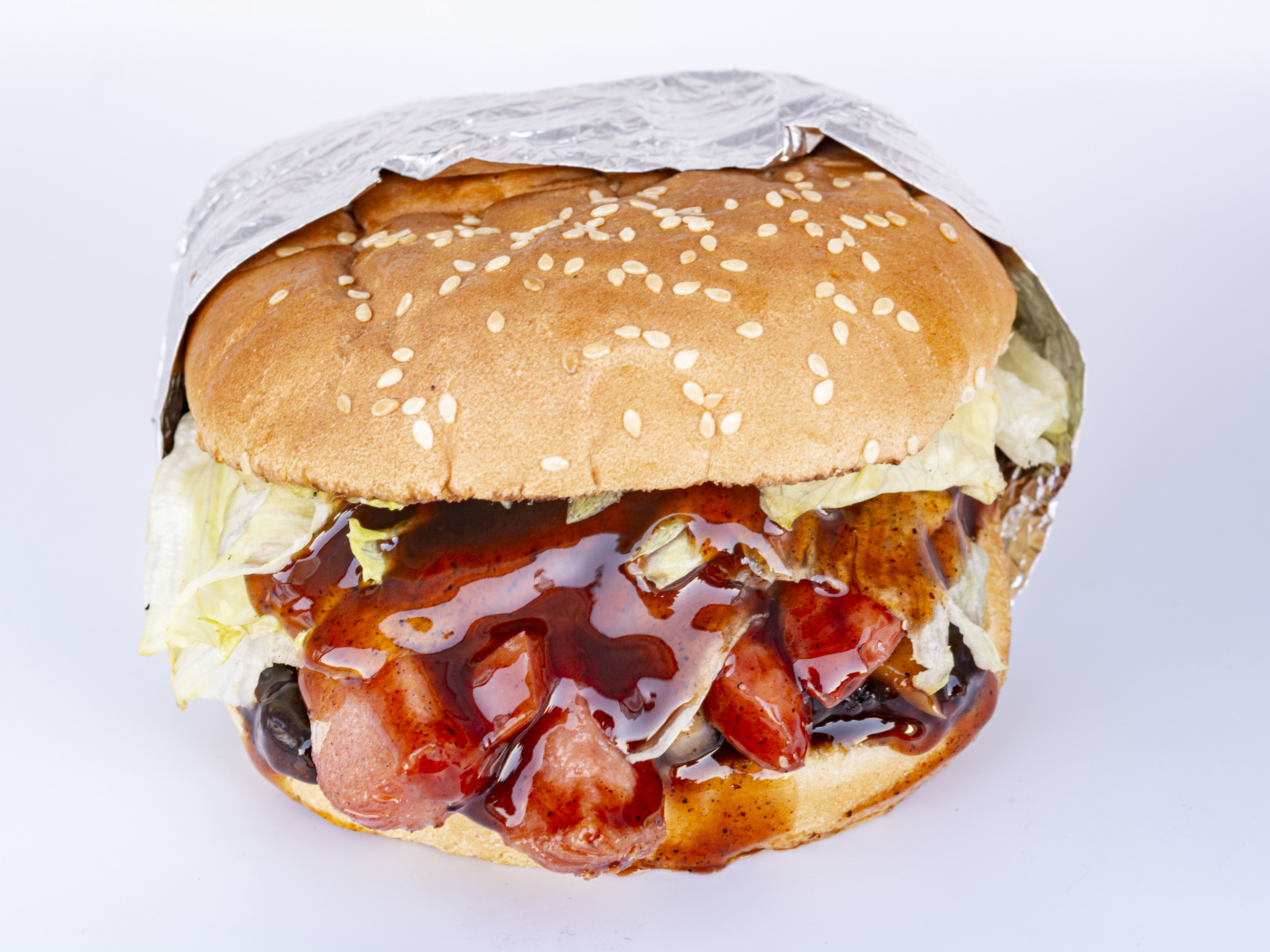Doble carne, queso, winnie, lechuga, tomate cebolla, líquidos y con salsa BBQ