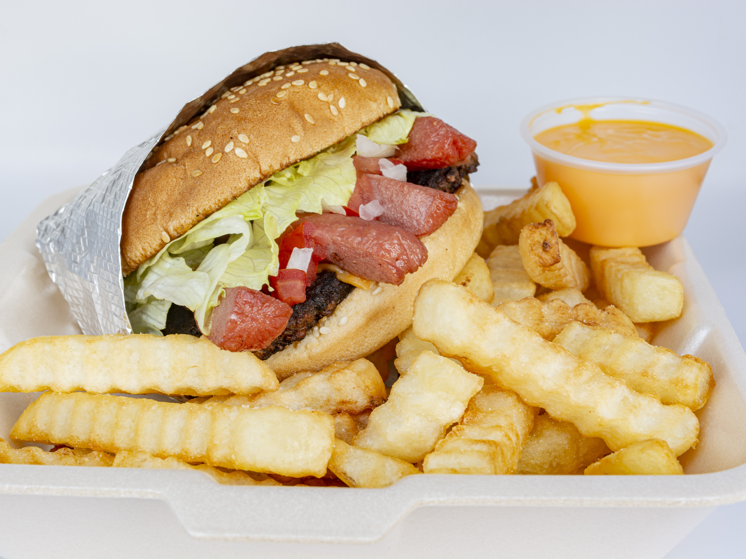 Hamburguesa Especial o Hawaiana y papas fritas con queso
