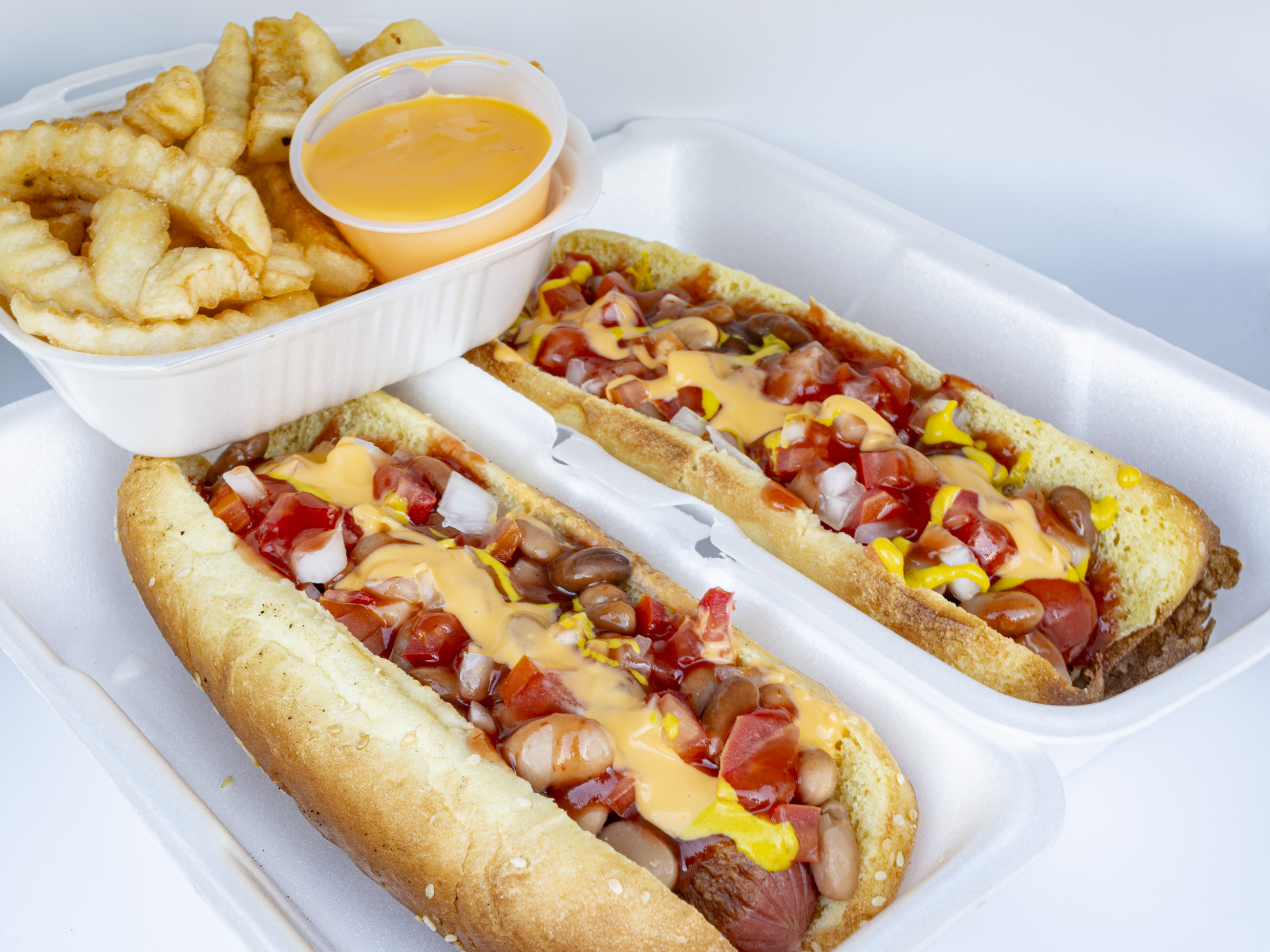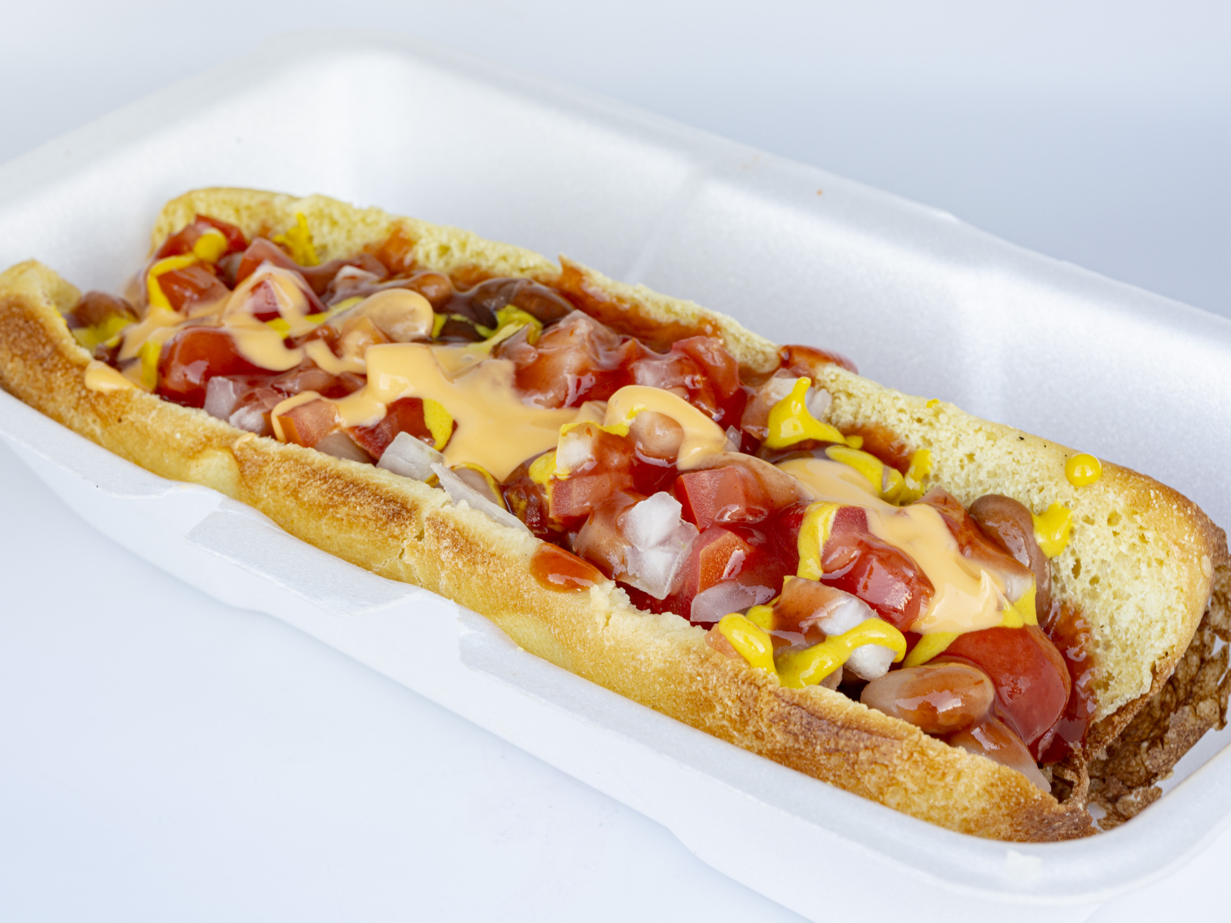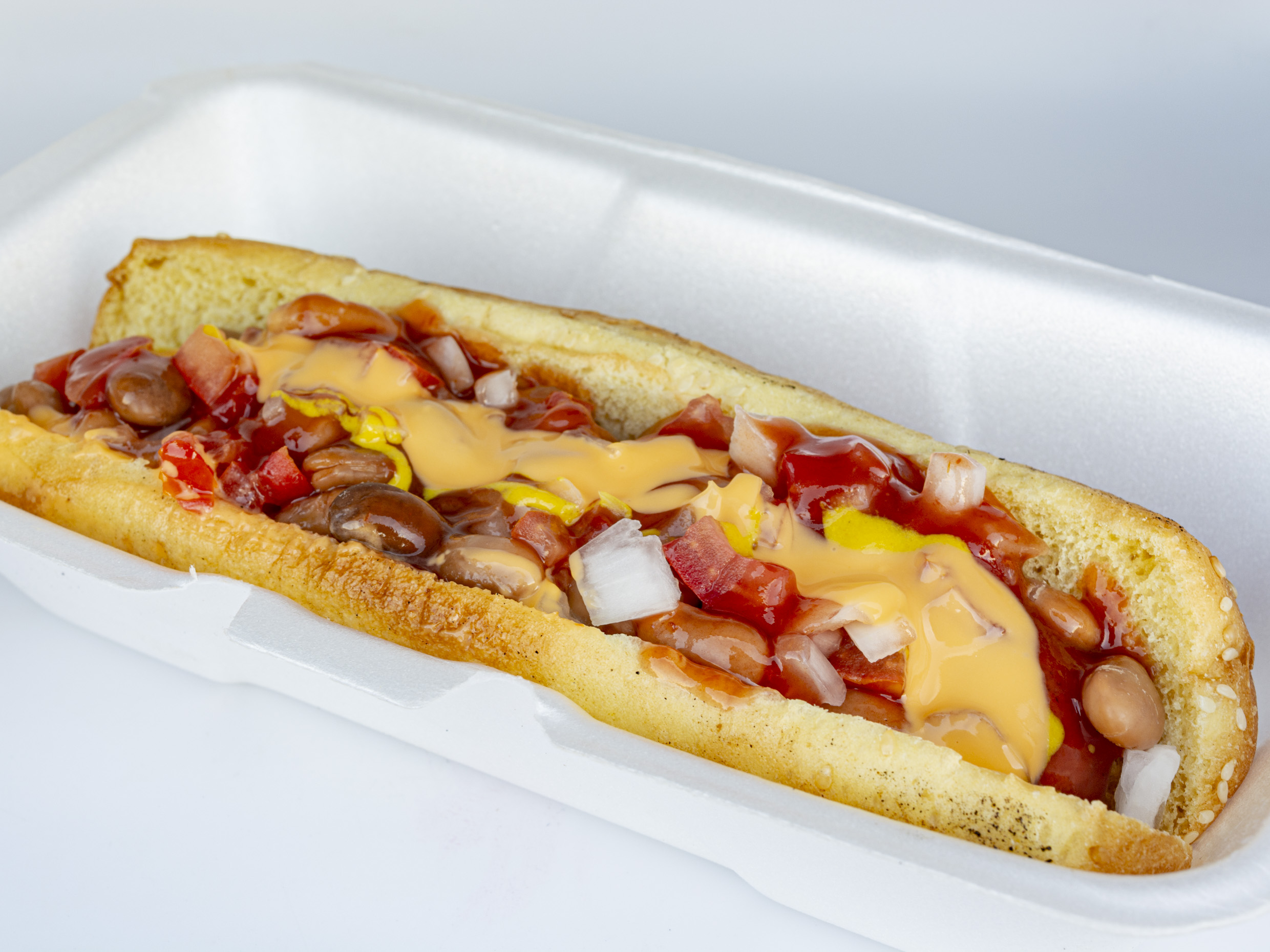 Hot dog, frijoles, tomate, cebolla, catsup, mostaza, mayonesa y queso para nacho