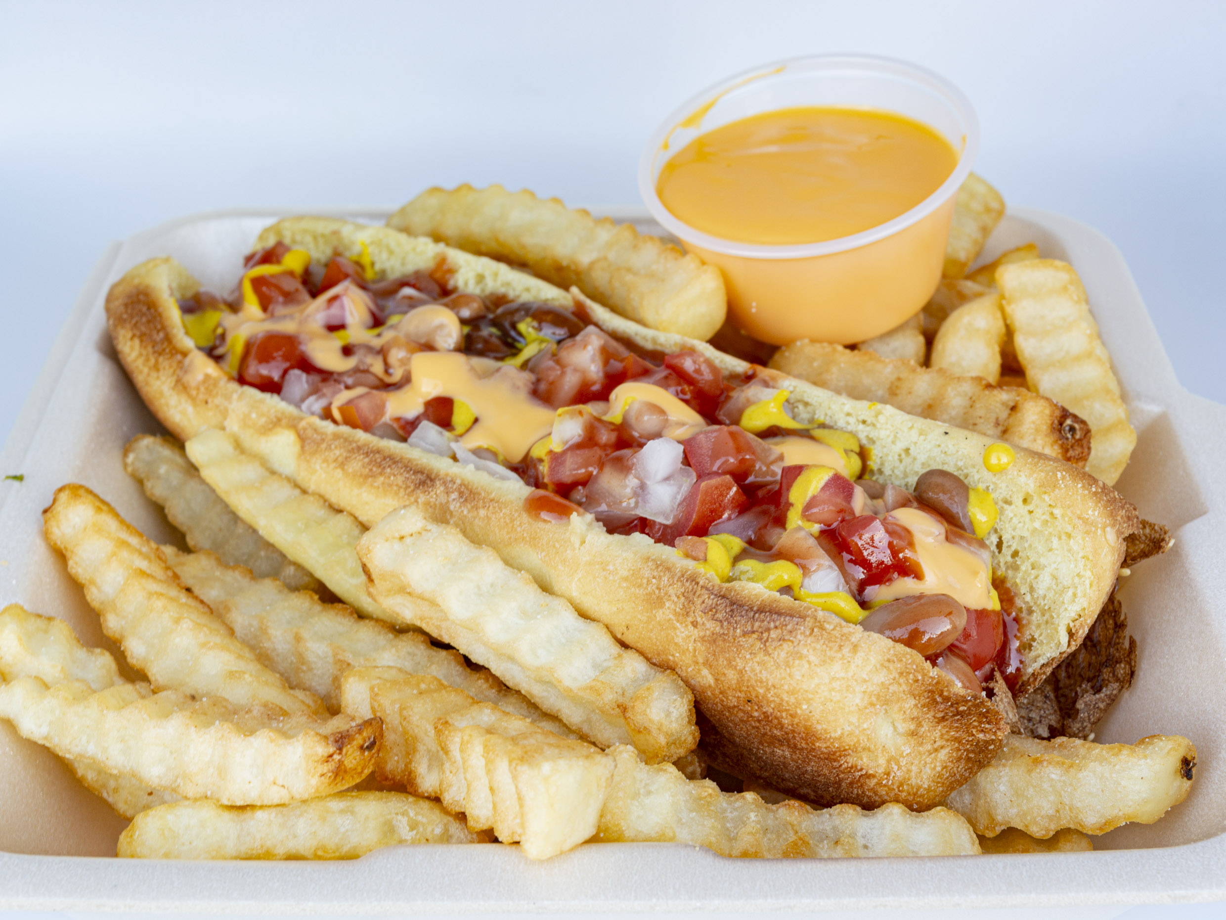 Hot dog envuelto en tocino, frijoles, tomate, cebolla, catsup, mostaza, mayonesa y queso para nacho. Con papas fritas y queso amarillo