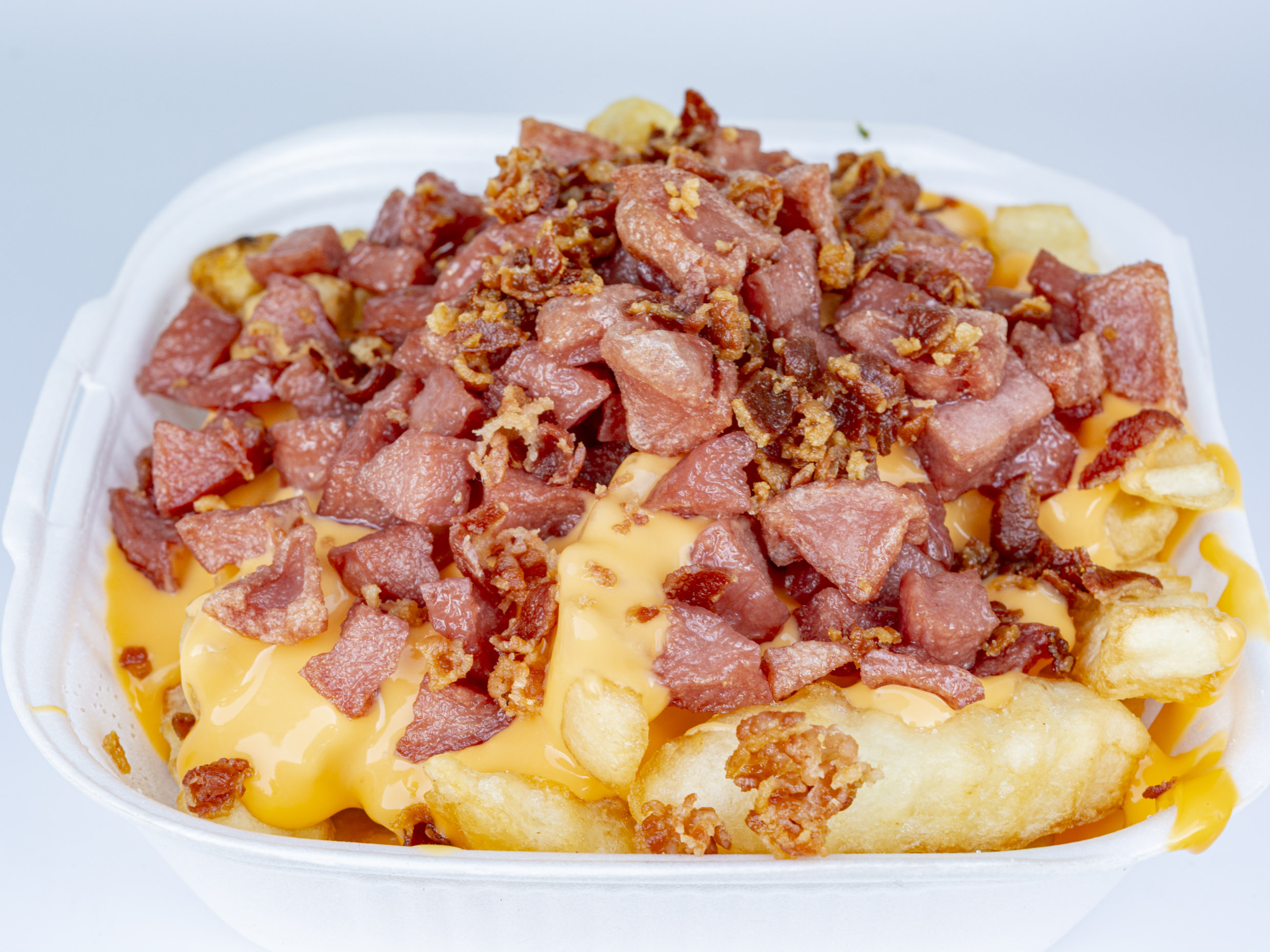 Papas fritas con queso, winnie y tocino frito