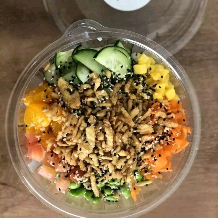 Bowl de 24oz con base de pasta de calabaza, 2 porciones de pollo, ensalada de cangrejo, edamames, mango, jalapeños, cilantro, zanahoria, ensalada de alga, cebolla crujiente con salsa teriyaki y spicy mayo.