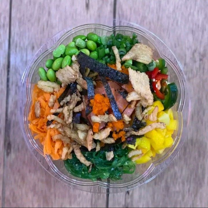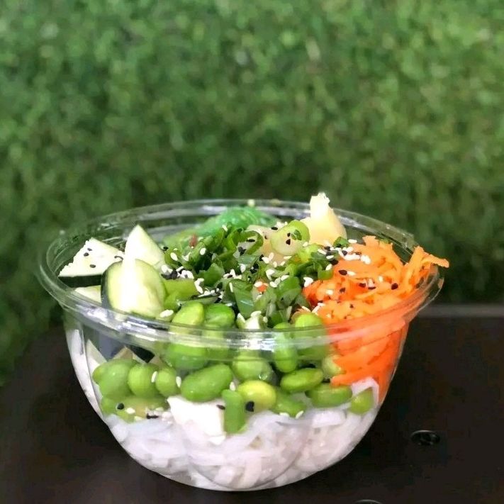 Bowl de 24oz con base de mezcla de lechugas, dos porciones de tofu, pepino, edamames, ensalada de alga, chile morrón, cilantro, almendra con salsa favorita.