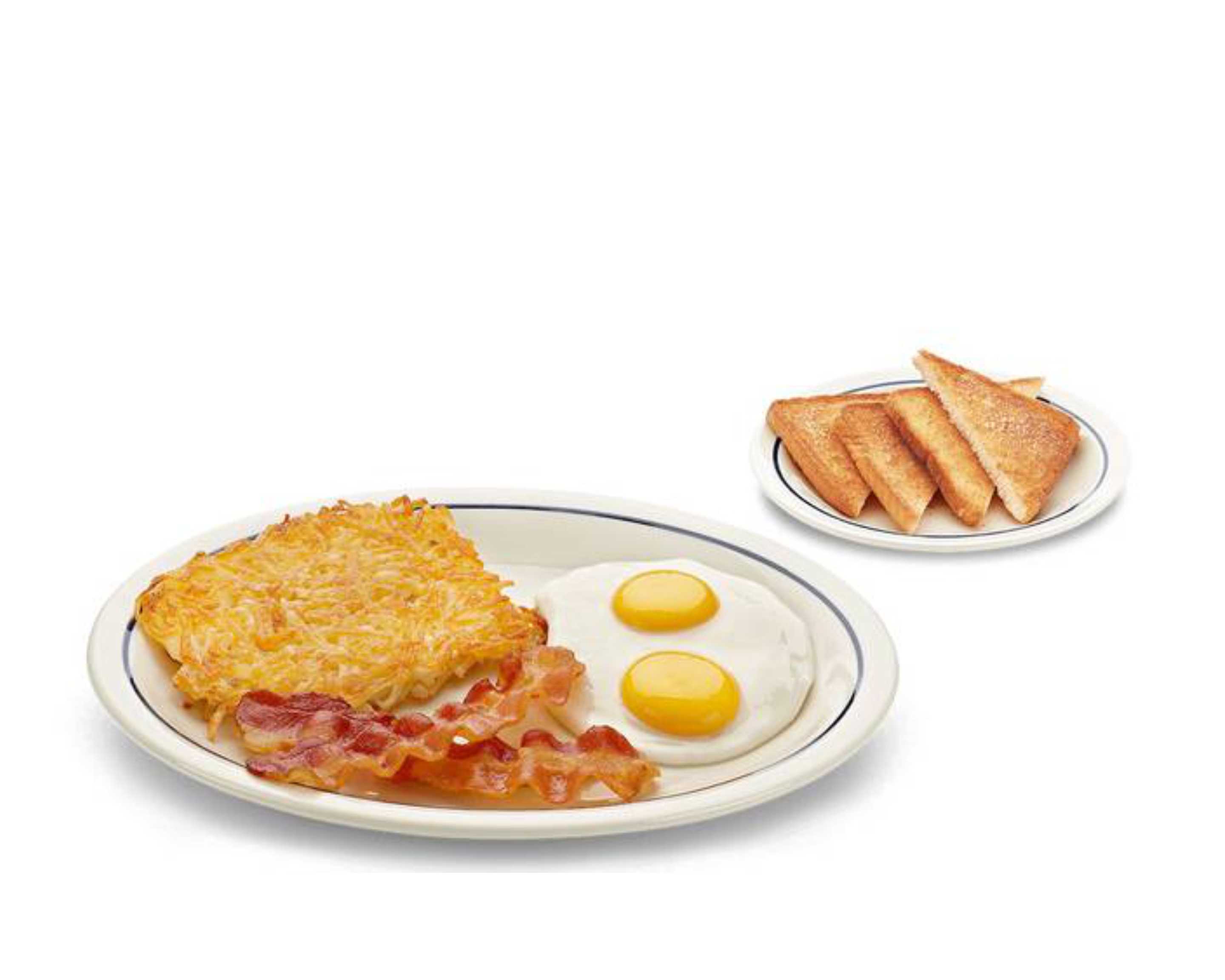 Dos huevos,papas hashbrowns y tú elección entre dos crujientes tiras de tocino o dos sabrosas salchichas. Servidos con pan tostado