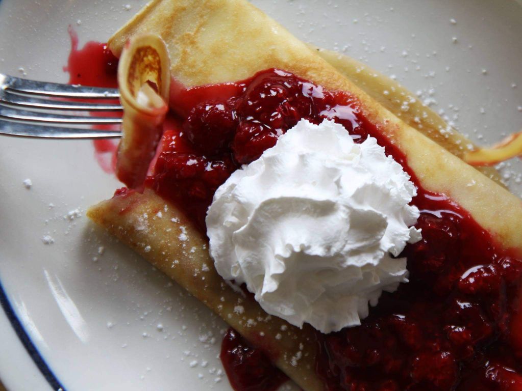 Dos deliciosas crepas rellenas de queso crema cubiertas con rebanadas de plátano,fresas dulces, azúcar glass y crema batida