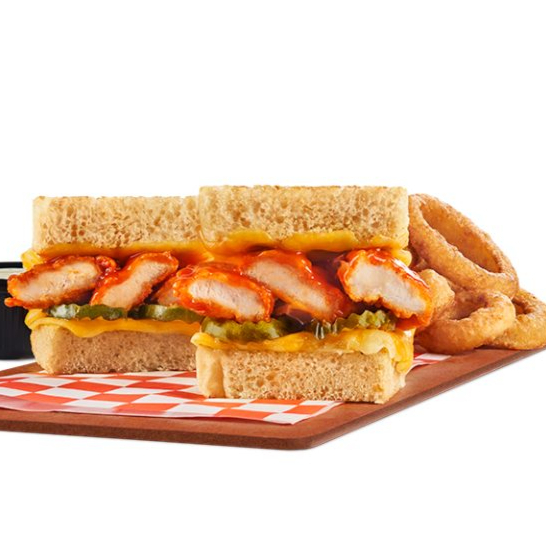 Tres tiras de pollo empanizadas cubiertas con salsa bufalo, quesos Monterrey jack y cheddar, pepinillos y aderezo ranch servido sobre pan sourdough