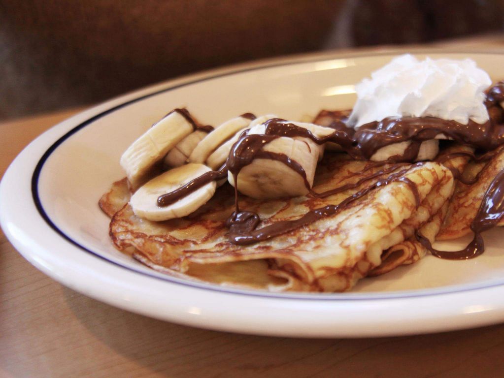 Dos crepas rellenas con Nutella y rebanadas de plátano. Cubiertas con fresas dulces, Nutella, azúcar glass y crema batida.