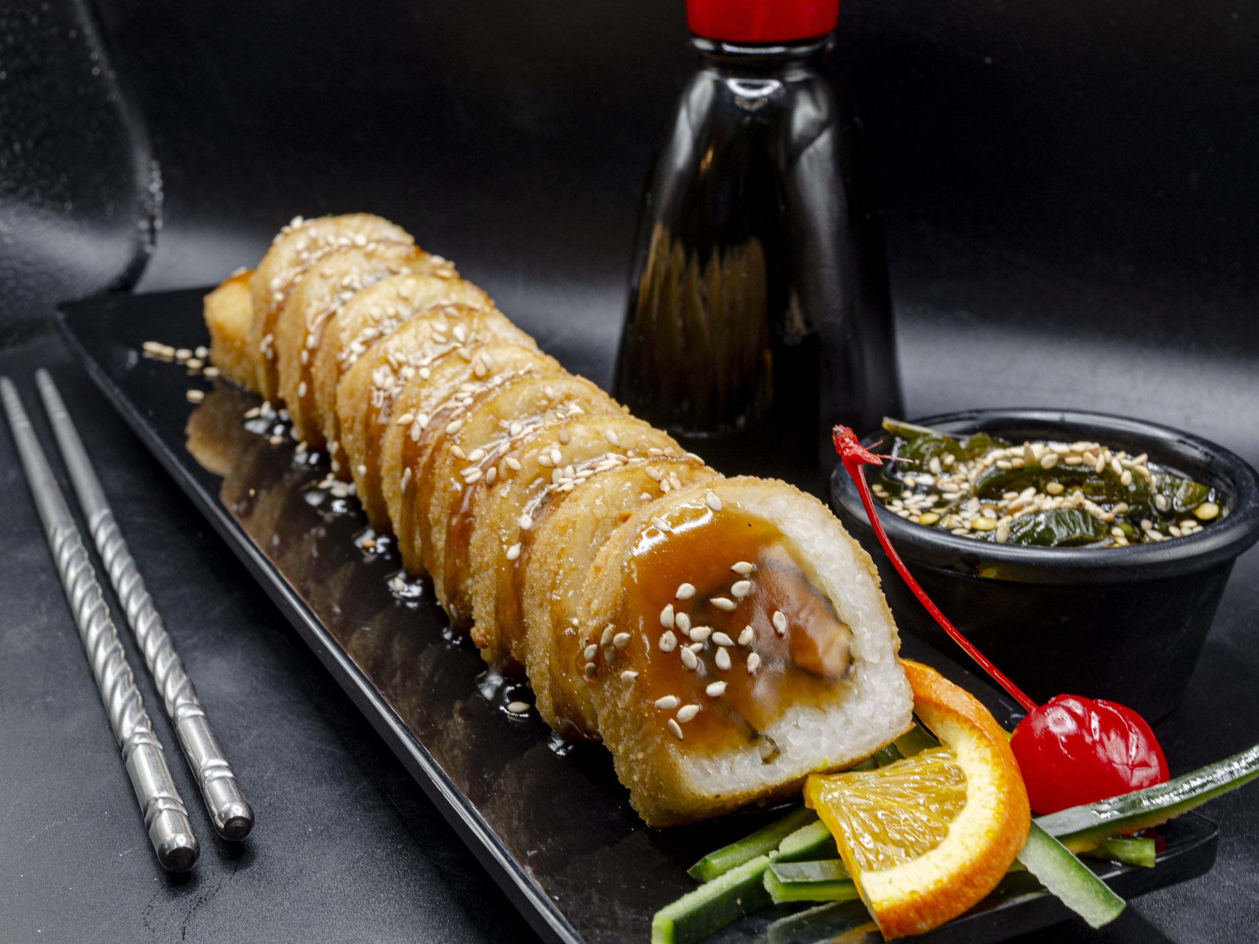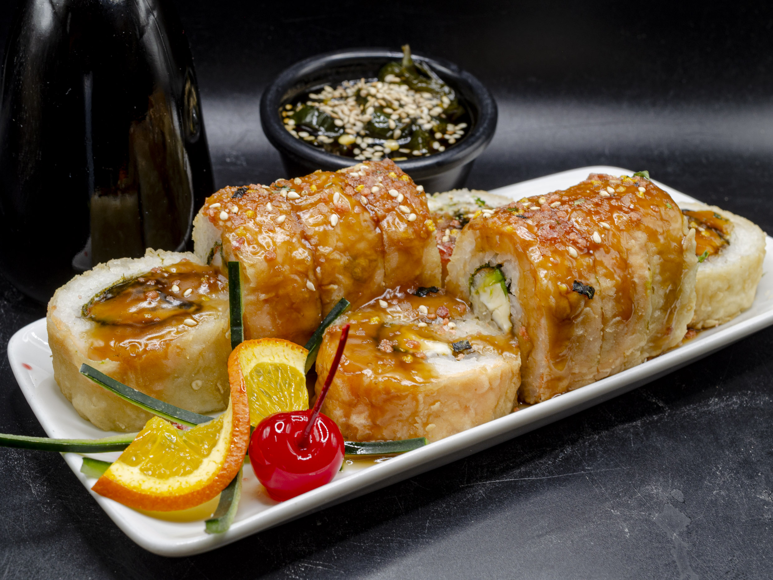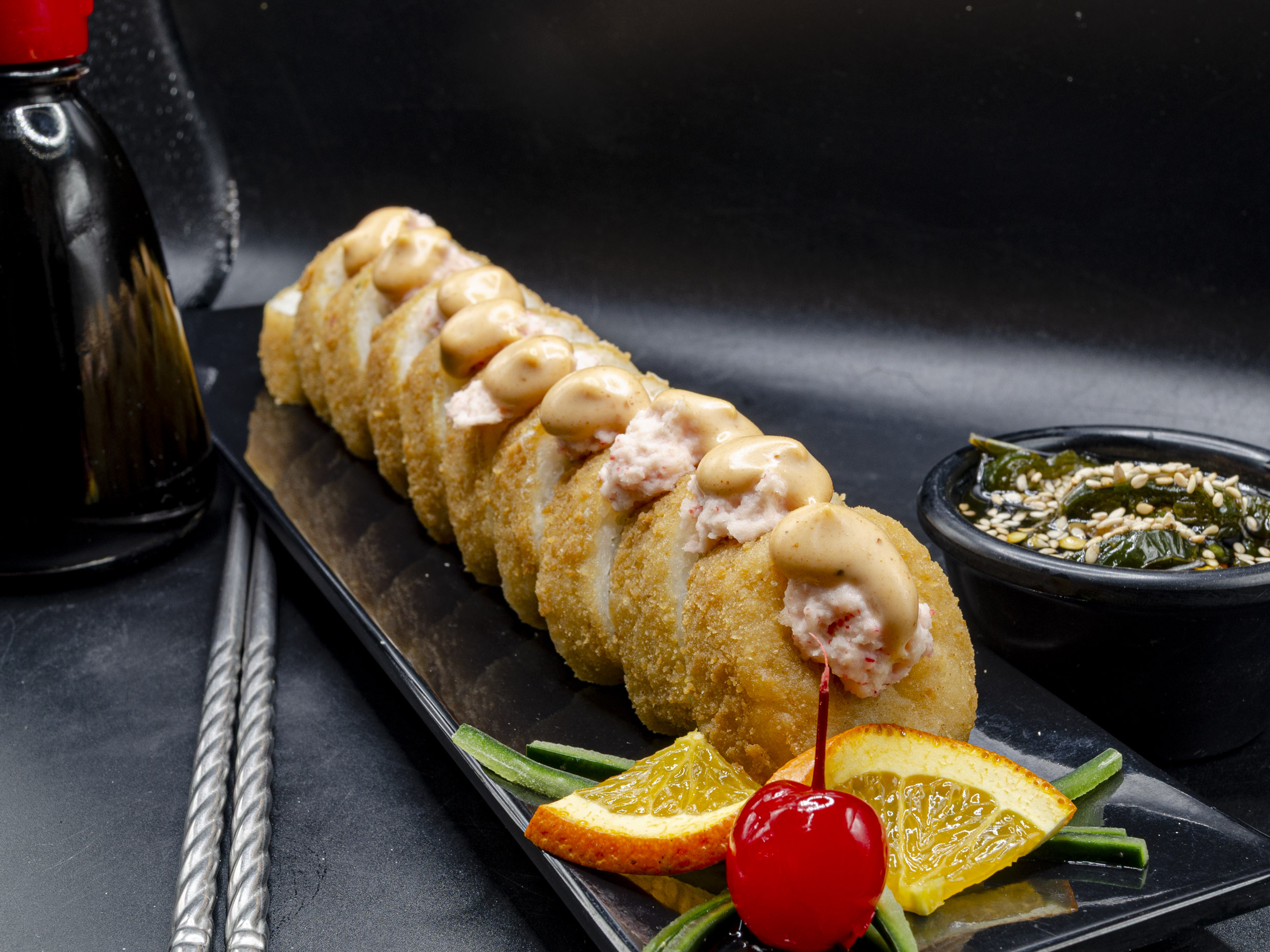 Cangrejo,queso,aguacate,lampreados individuales,en salsa de anguila y ajonjoli