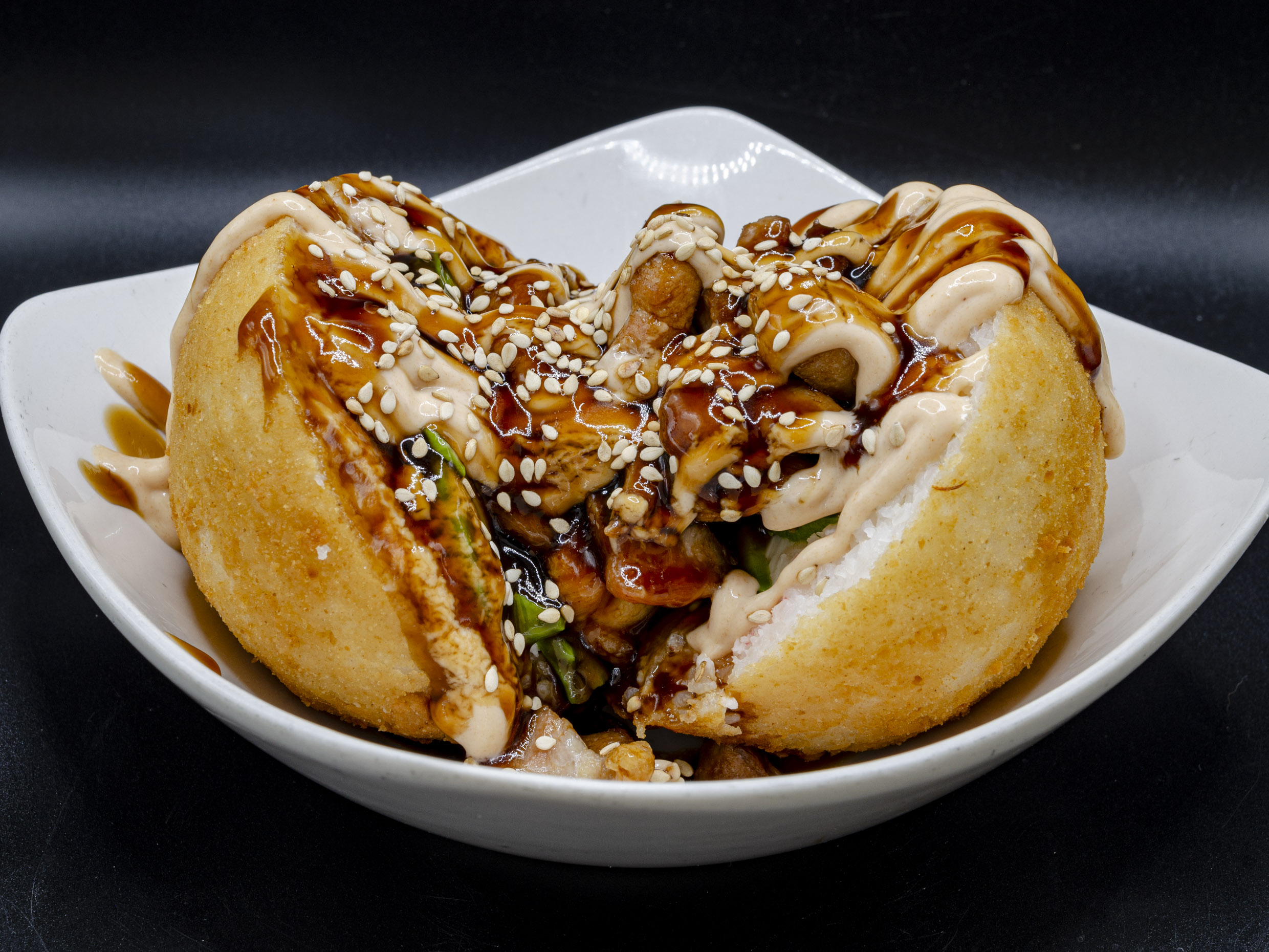 Cangrejo,queso,aguacate,chiles toreados,cebollin,con salsa de anguila y ajonjoli