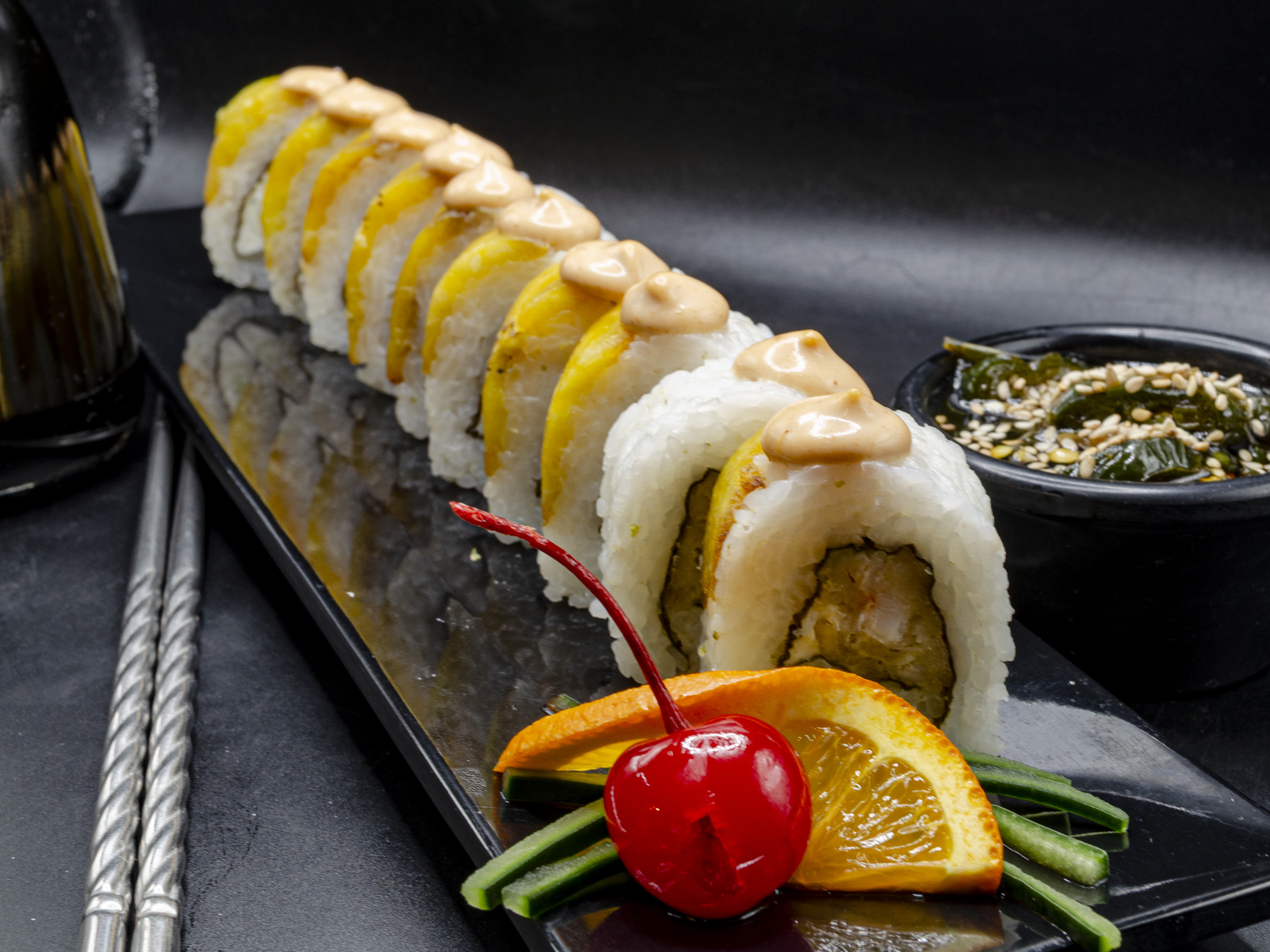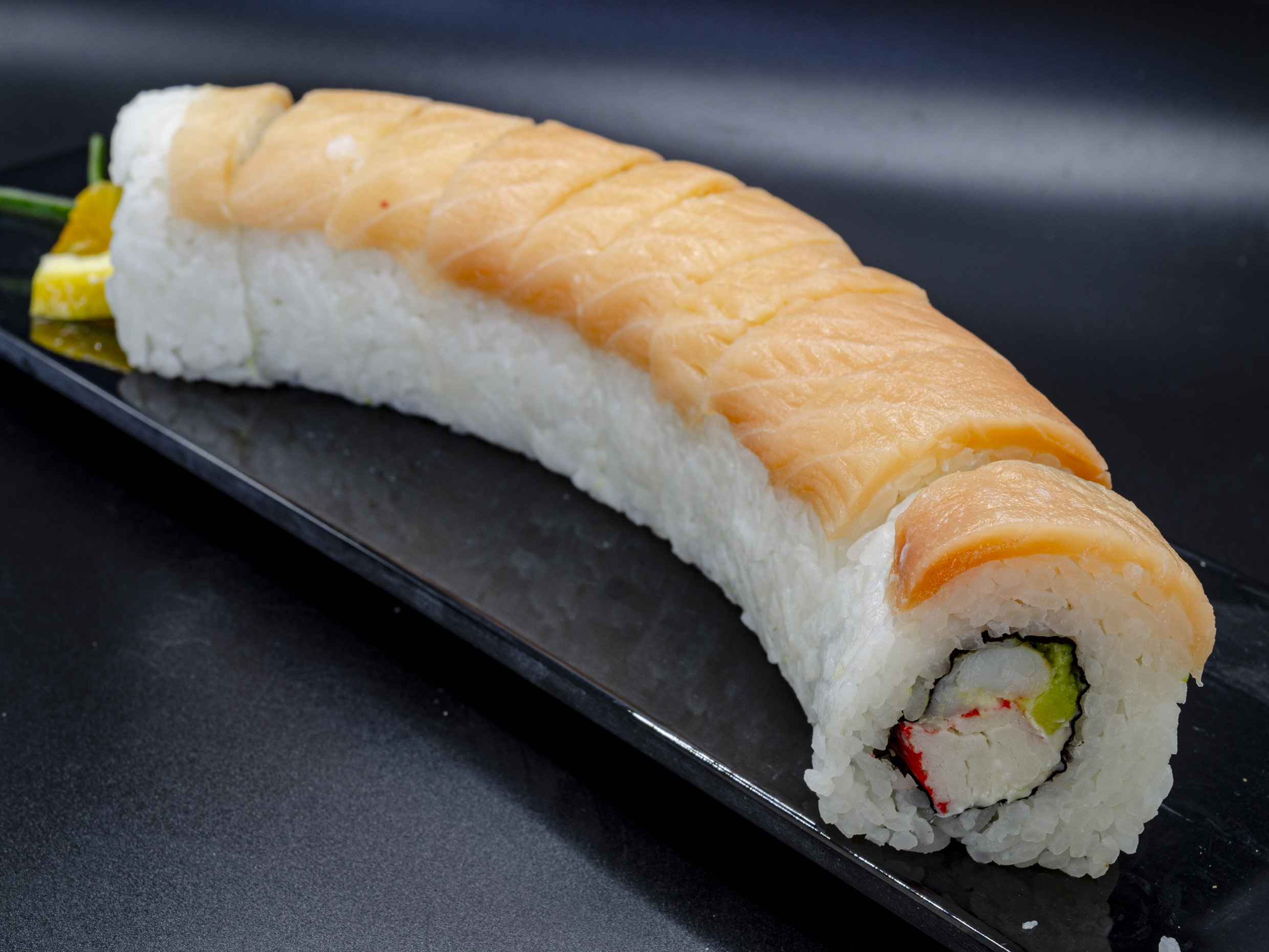 Camaron,queso,aguacate,jalapeño,cubierto de salmon y bañado en salsa de anguila