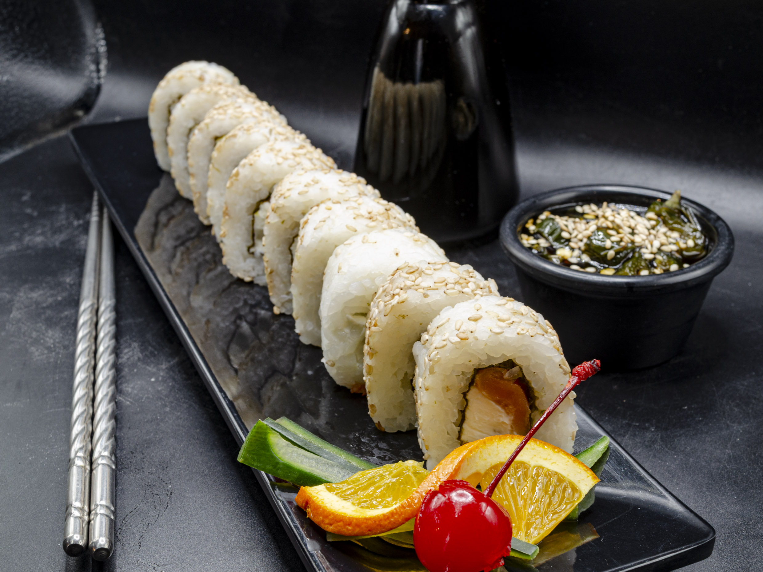 Salmon,aguacate,pepino, cubierto con queso,mazago y ajonjoli