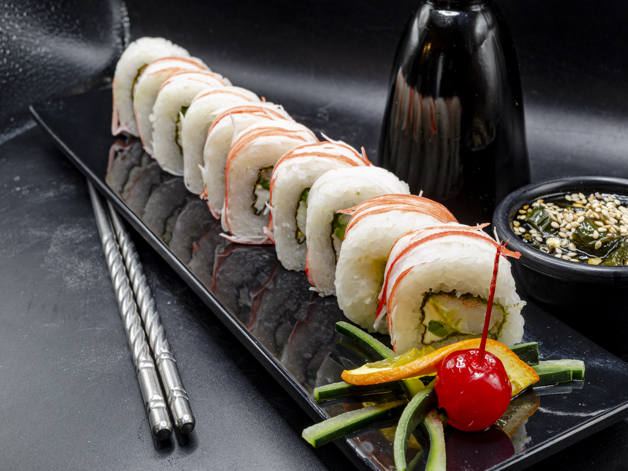 Cangrejo,pepino,aguacate,cubierto de ajonjoli