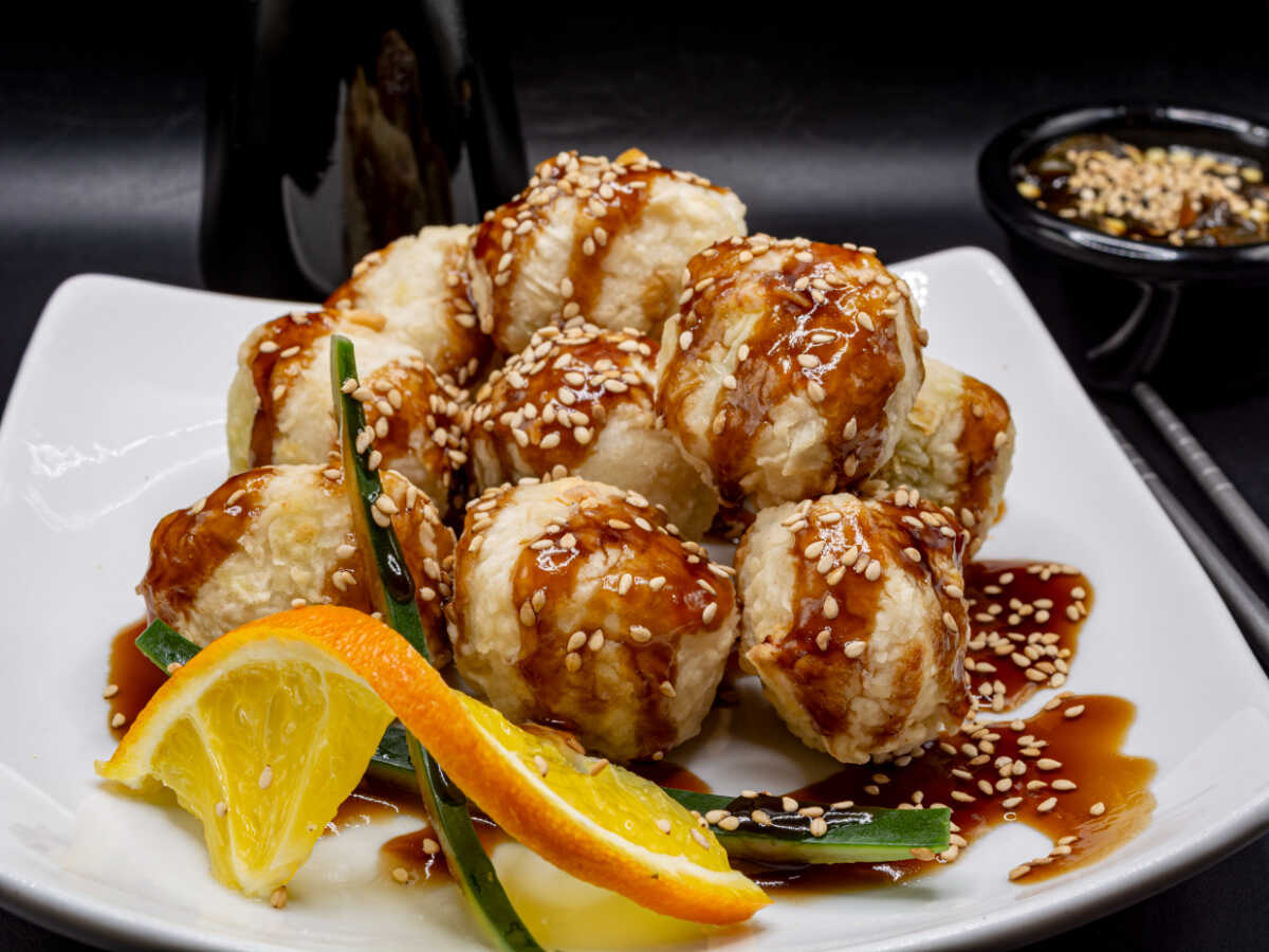 Queso, aguacate, pepino, tampico, bañadas con salsa tártara, salsa de anguila y ajonjolí.