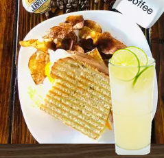 Panini Juaritoz *1 pan artesanal con ajo y orégano 15 CM * 10 mayonesa, jamón, 80 GR de queso suizo, lechuga, pepinillo, salsa de la casa + AMERICANO 16oz*1