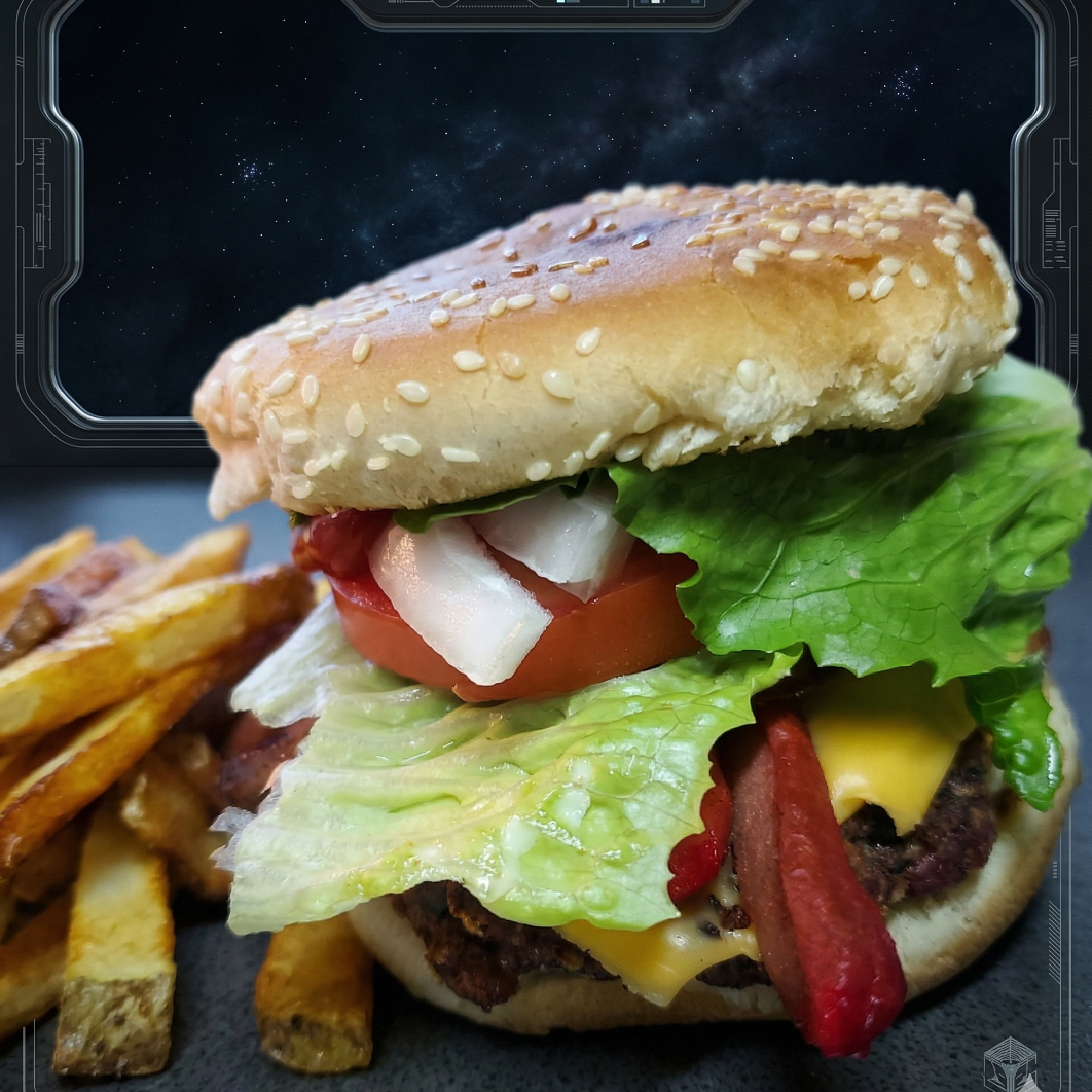 Carne estilo casero. Queso amarillo, Winnie rojo, Lechuga, Tomate, Cebolla, Líquidos, Mostaza, Catsup. Acompañada de papas fritas naturales