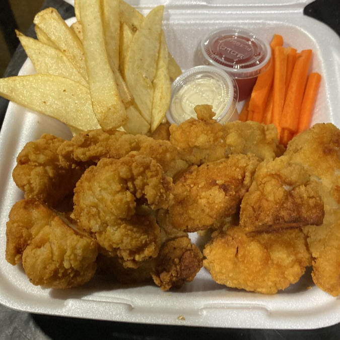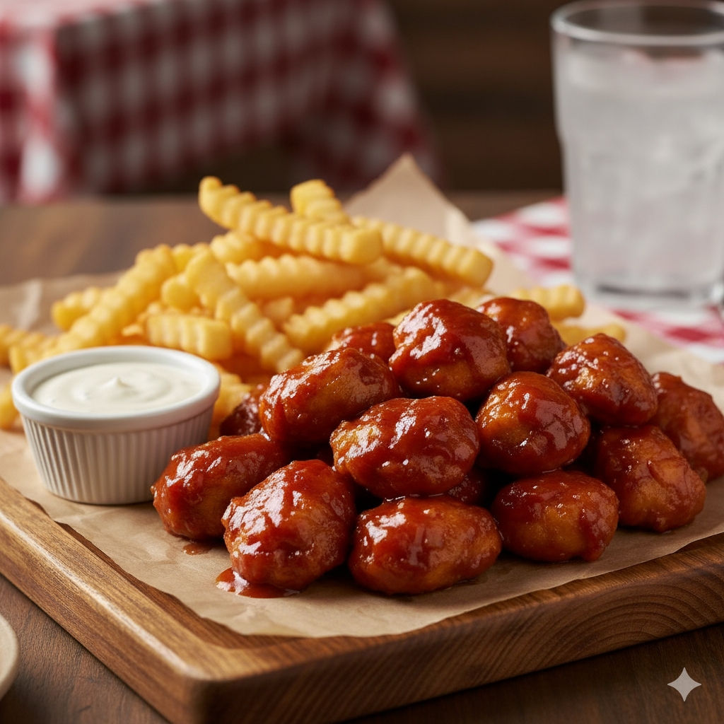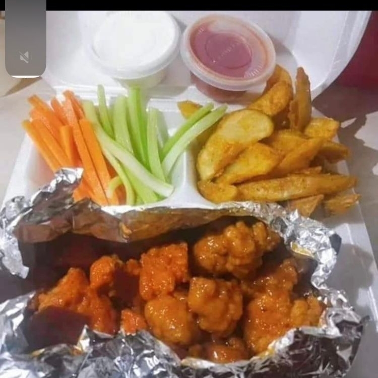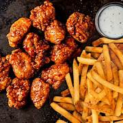 Bonelees sabor chipotle cremoso con una porcion de papas a la francesa ,apio,zanahoria,ranch,y capsup