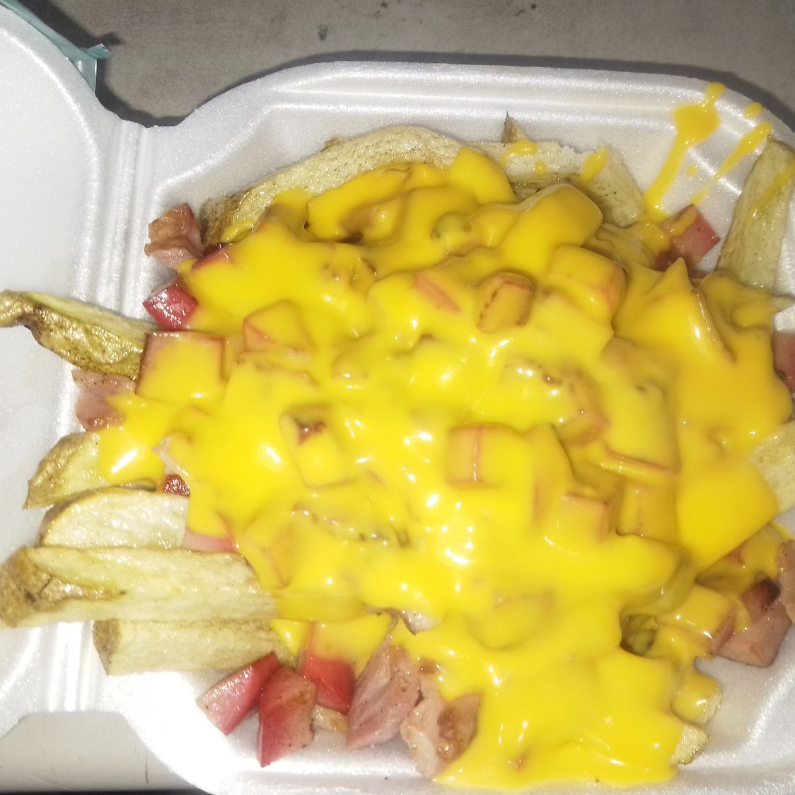 Papas fritas con queso, tocino, Winnie, chiles curtidos.