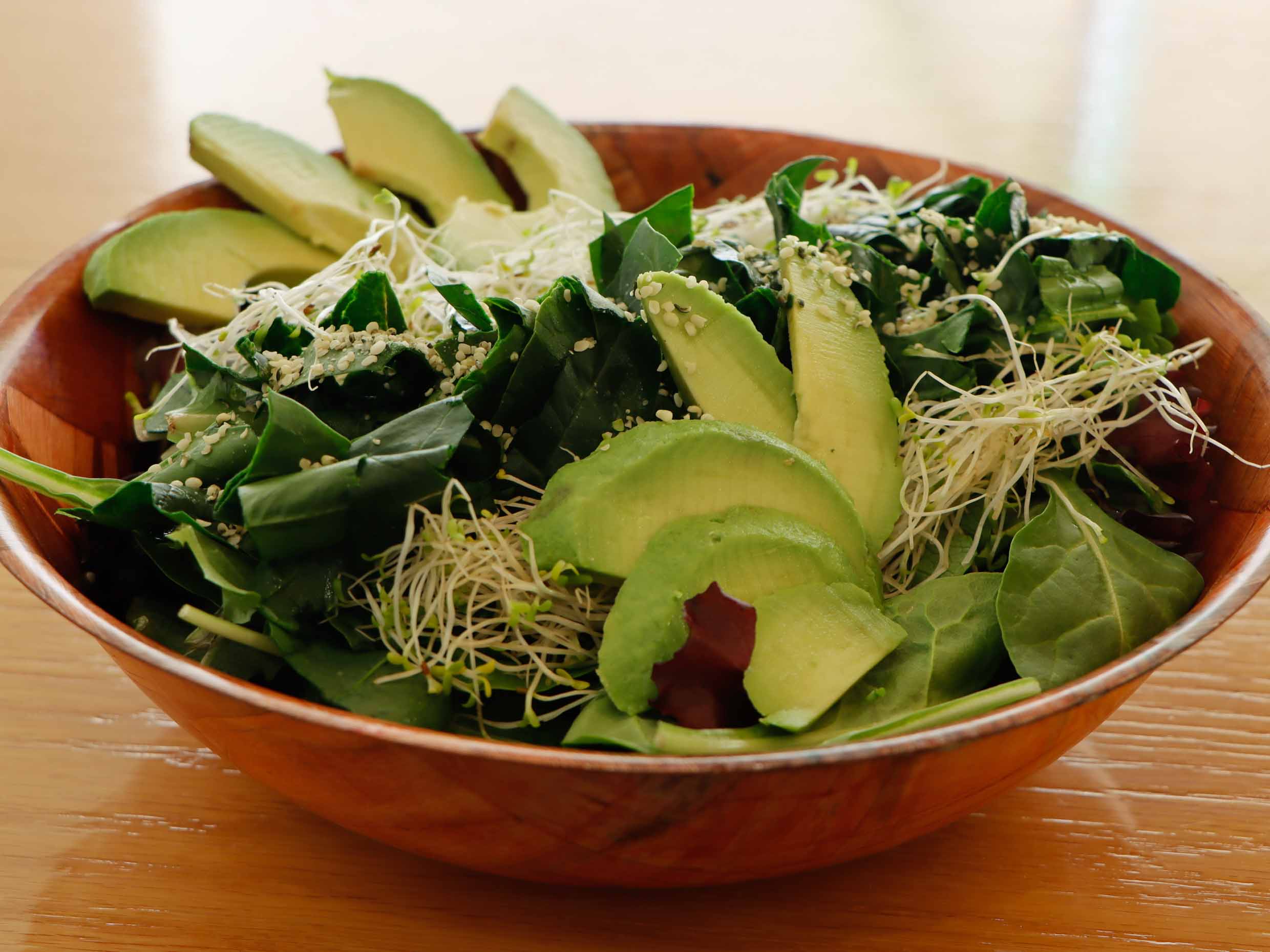 Germinado de alfalfa, hojas verdes orgánicas, espinacas, aguacate, semilla de hemp, con vinagreta de manzana-limón.