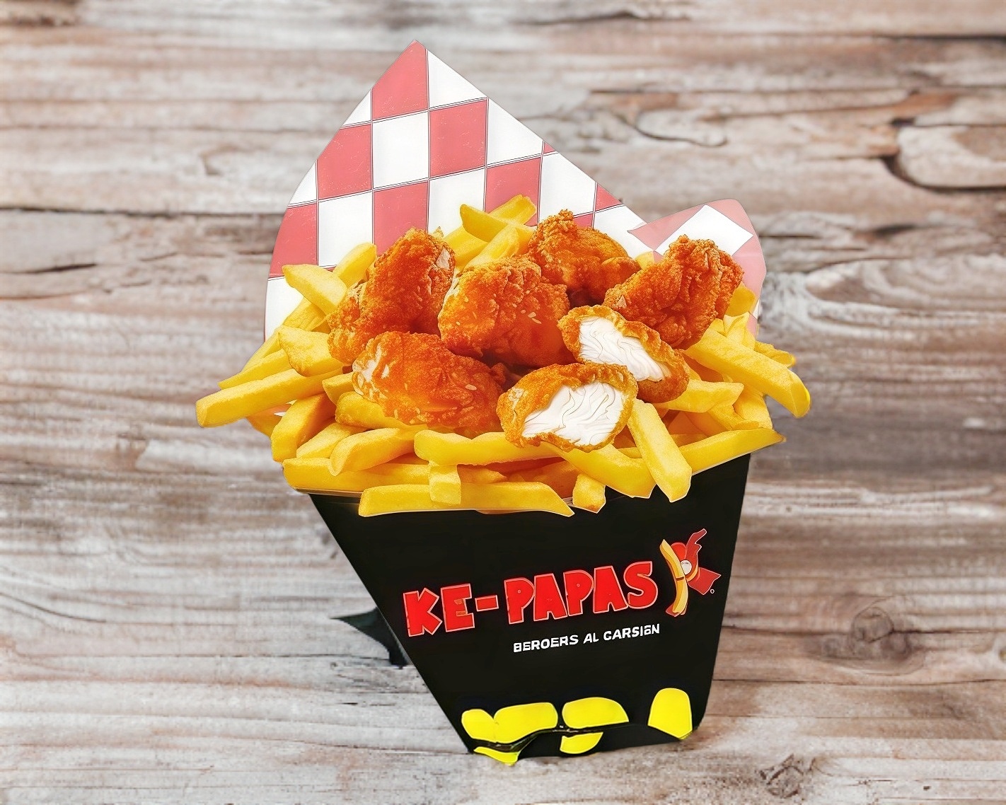 Papas, 10 mini boneless, queso, ranch, salsa a elejir