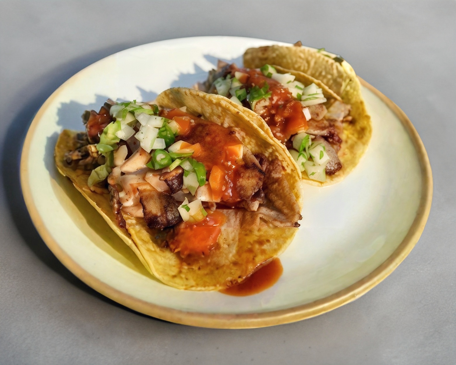 4Tacos tortilla mediana bien servidos con sus respectivas salsas aparte